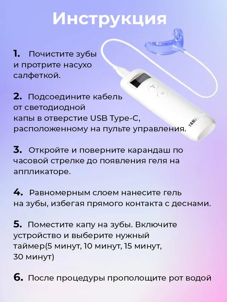 Совместимость с реставрациями: гель не изменяет цвет композитных пломб и керамики. При наличии виниров рекомендована консультация стоматолога.