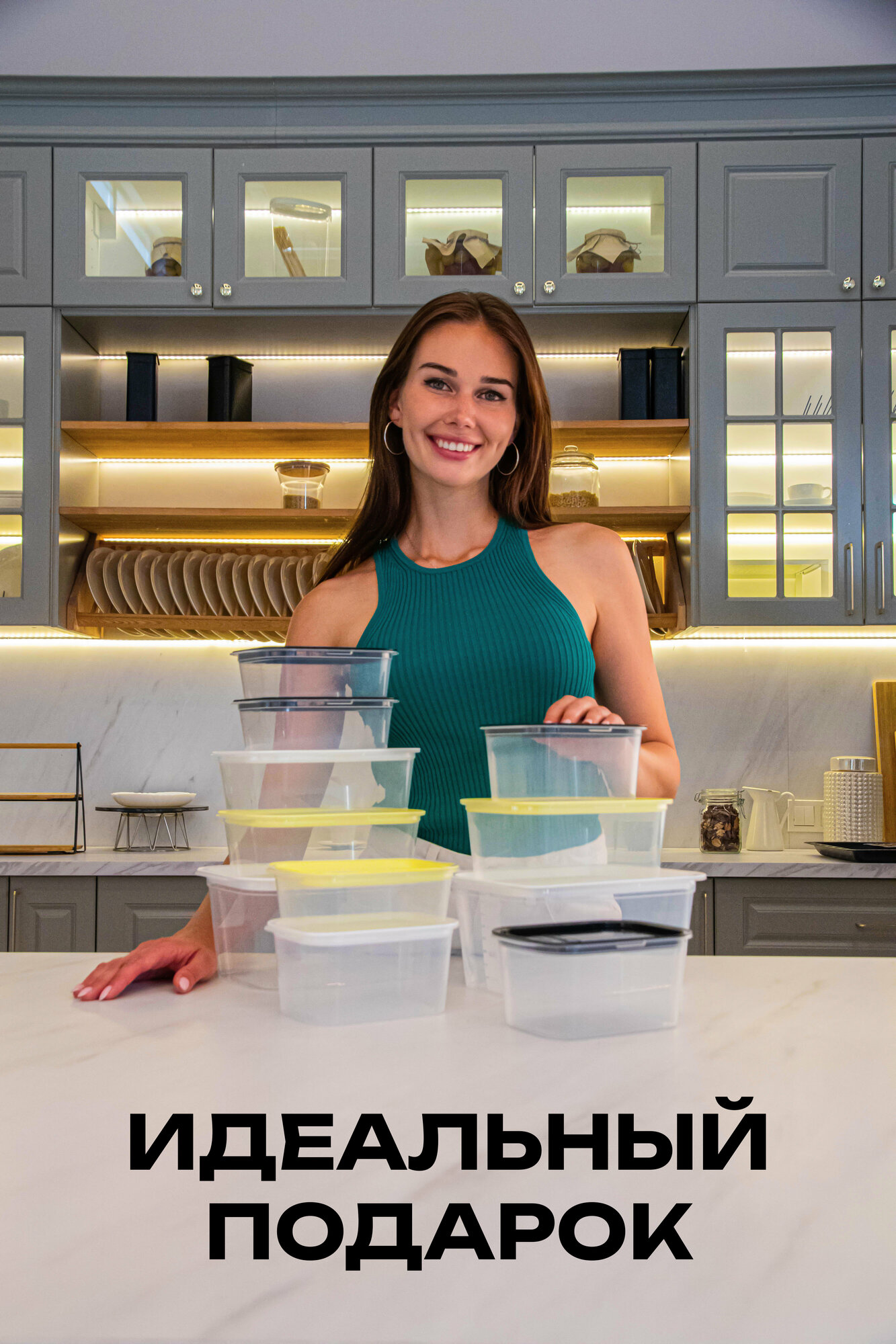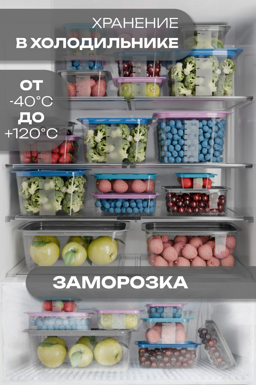 - Варианты размеров включает контейнеры от 0.2 до 2.5 литров для хранения порционных блюд и крупногабаритных продуктов