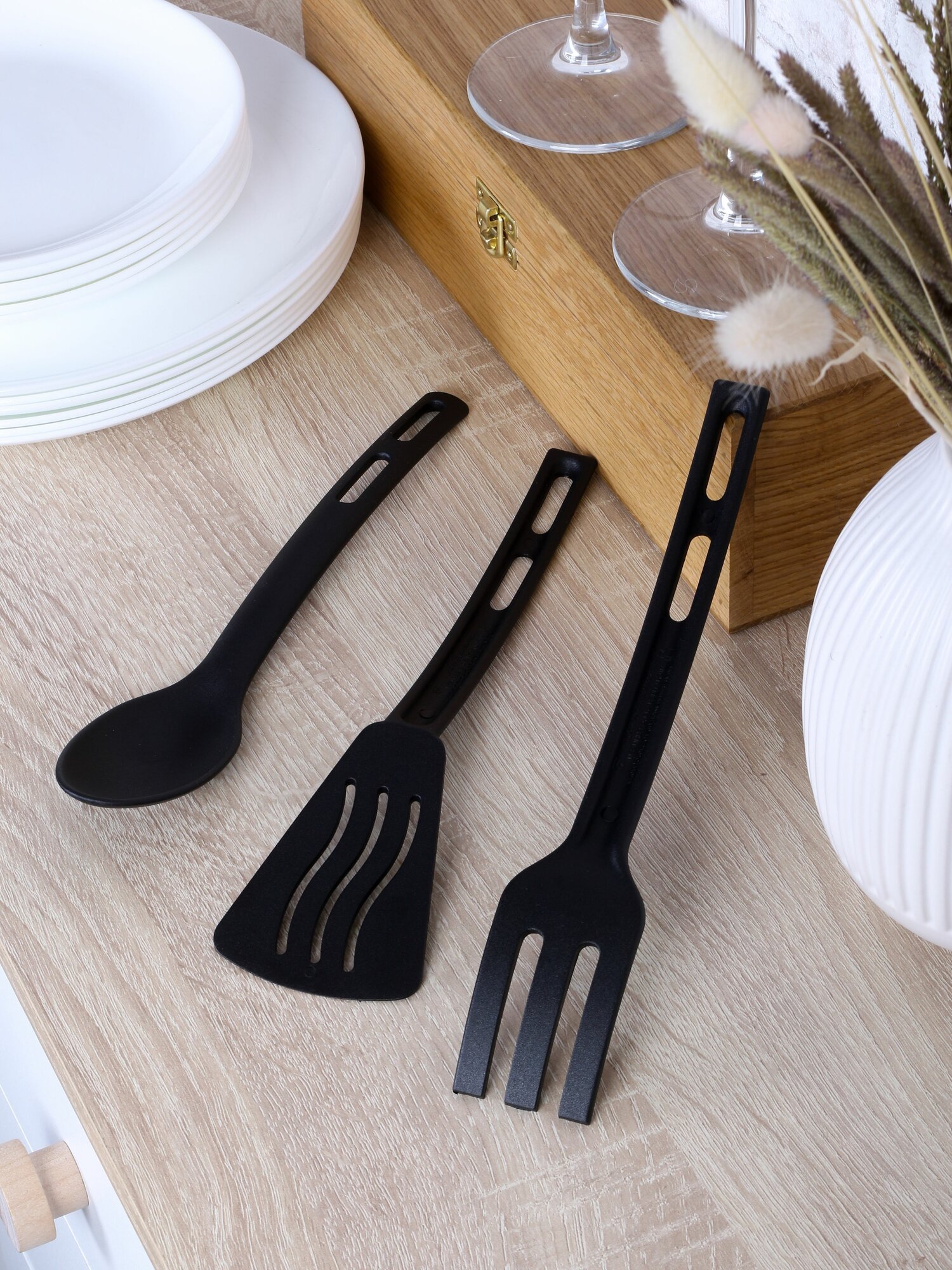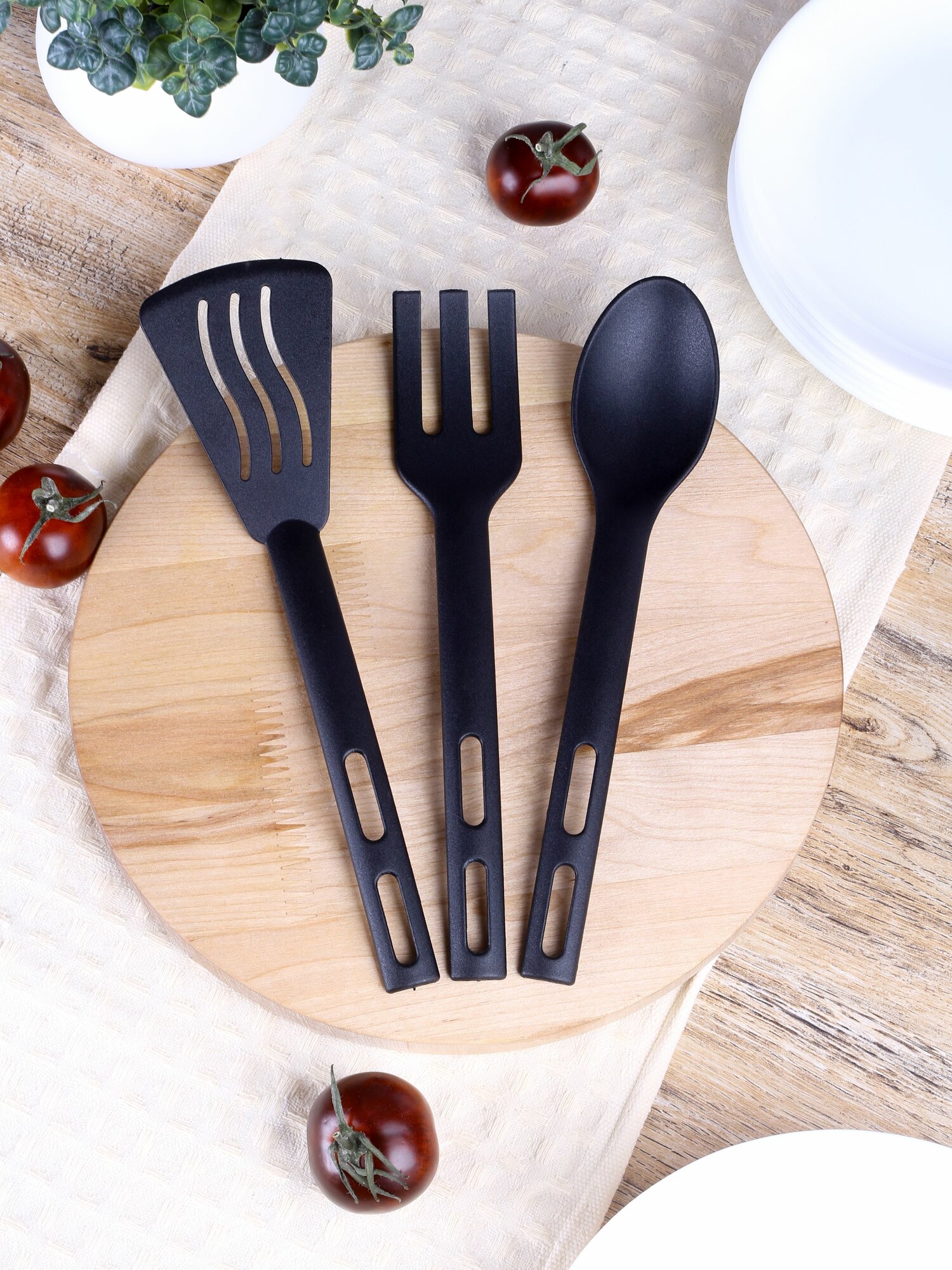 - 3 профильных инструмента: широкая блинная лопатка (18,5x8 см), поварская ложка-шумовка (120 мл), вилка с закругленными зубцами