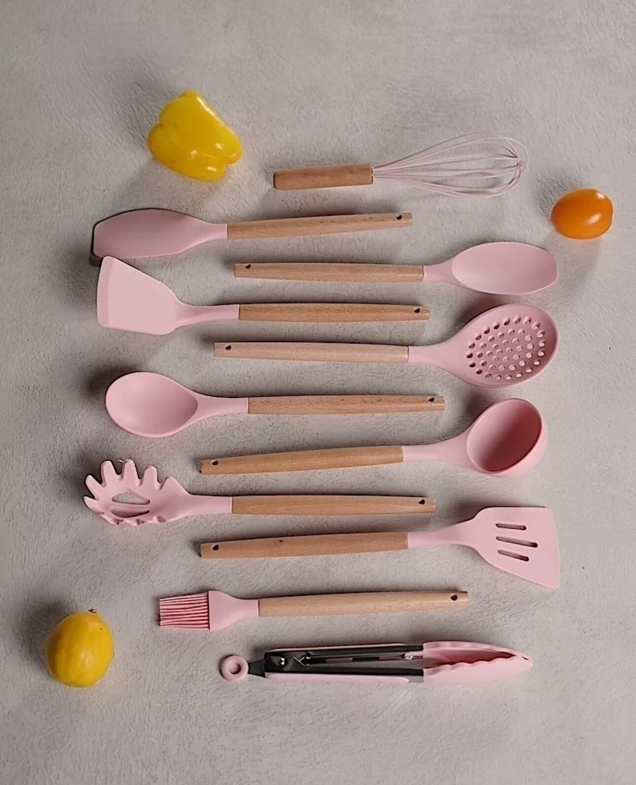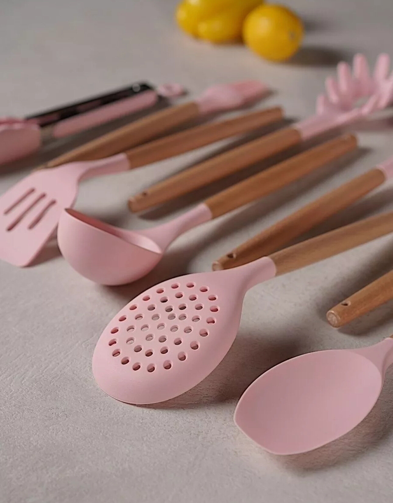 - 10 универсальных аксессуаров: 3 лопатки разных размеров, 2 ложки-шумовки, тёрка, нож для пиццы, пресс для картофеля, скребок и щипцы