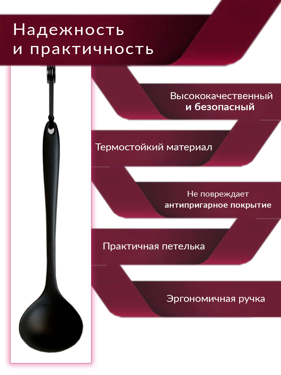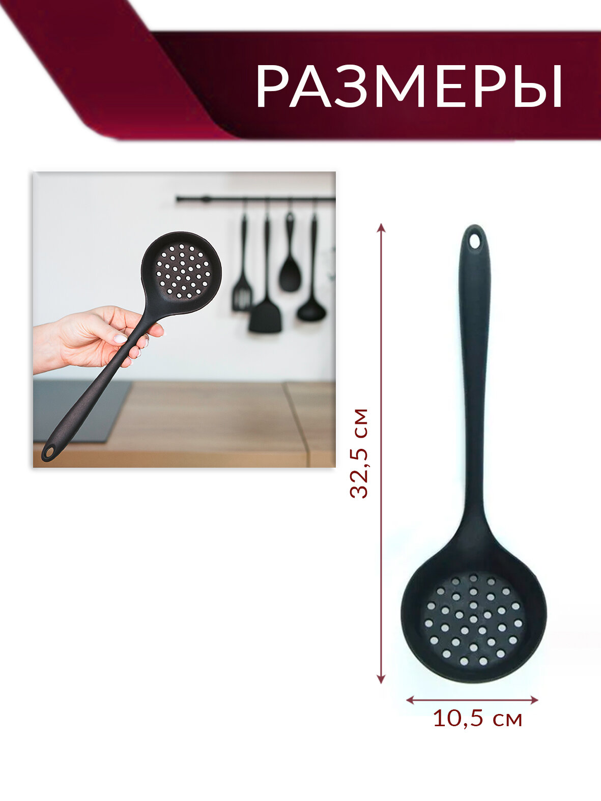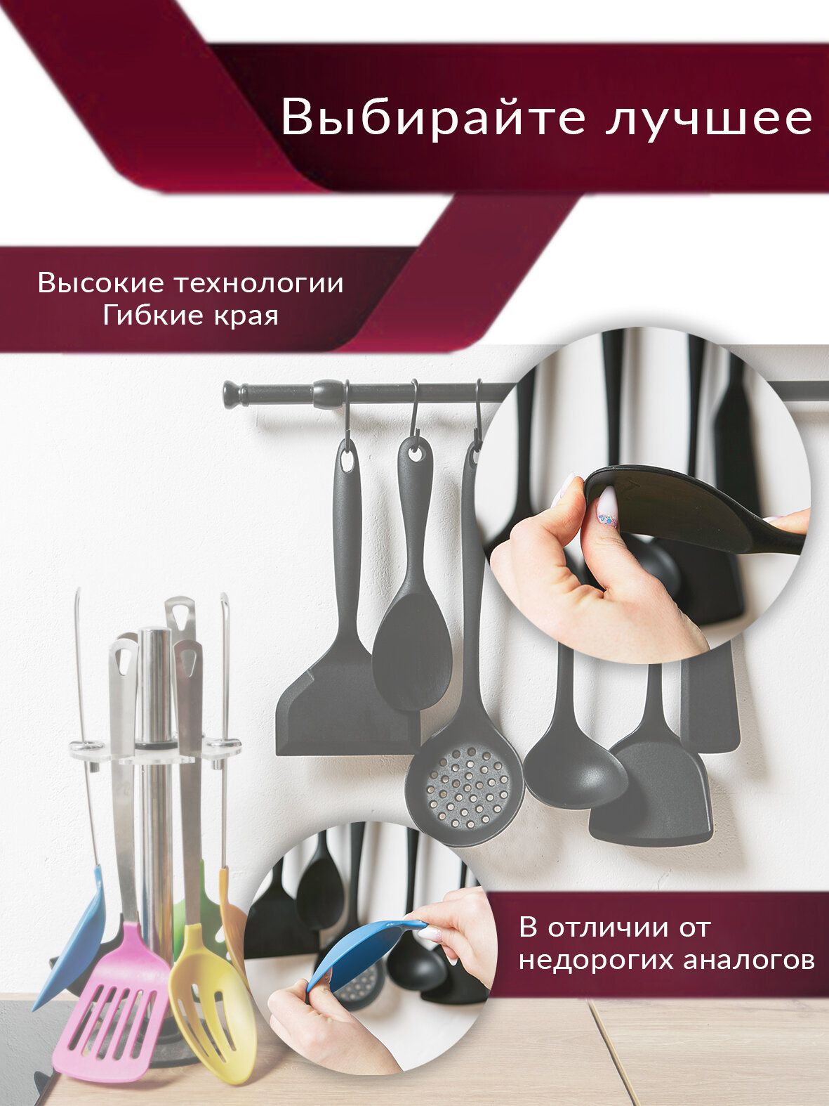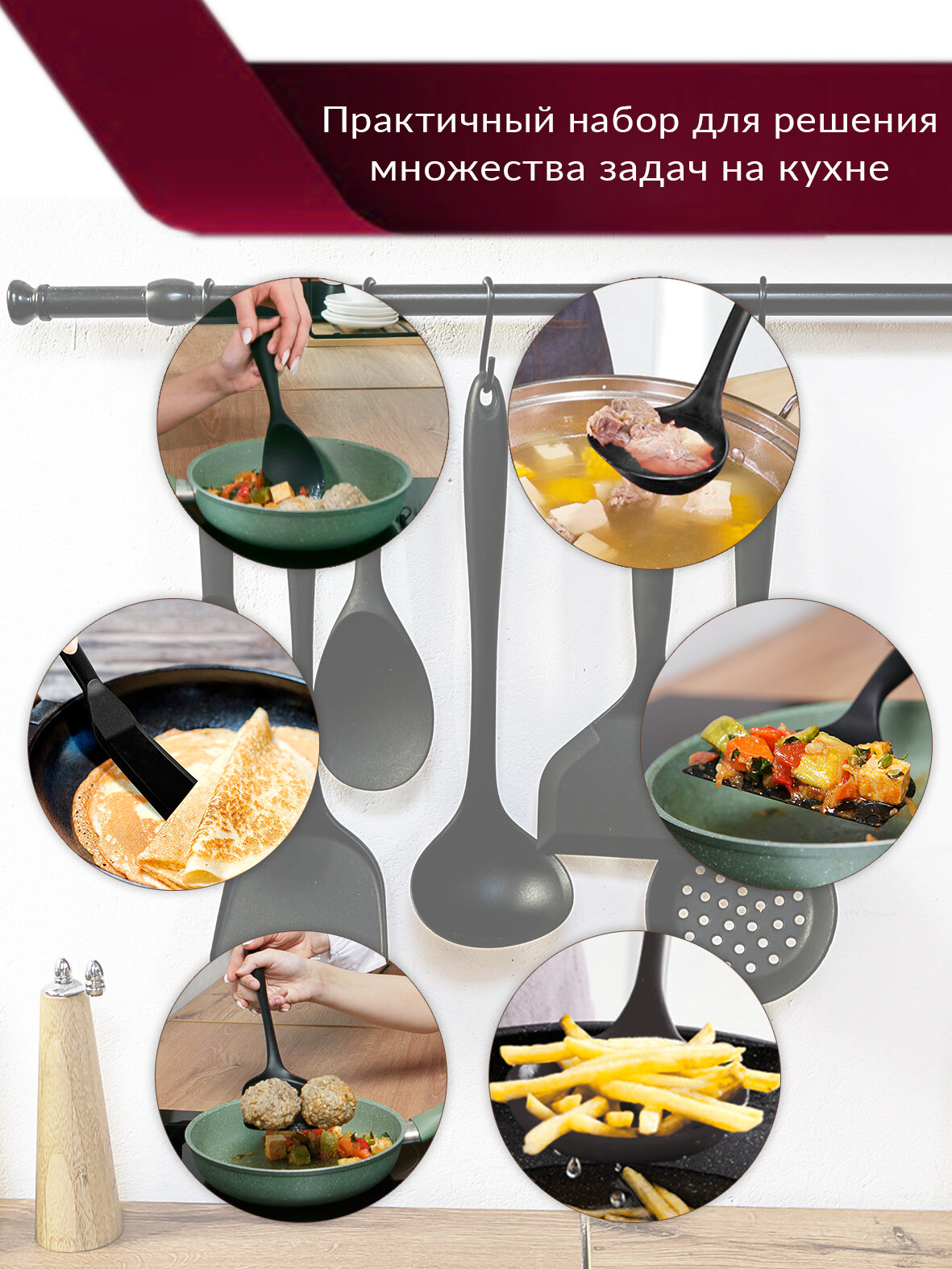Набор "Станислав" включает 6 профессиональных инструментов из пищевого силикона: ложку для спагетти с перфорацией, дуршлаг-ложку для отваривания овощей, классическую шумовку, узкую лопатку для переворачивания продуктов, половник для супов и специальную широкую лопатку для блинчиков. Каждый предмет оснащен нескользящей термостойкой ручкой, обеспечивающей безопасное использование даже с мокрыми руками.