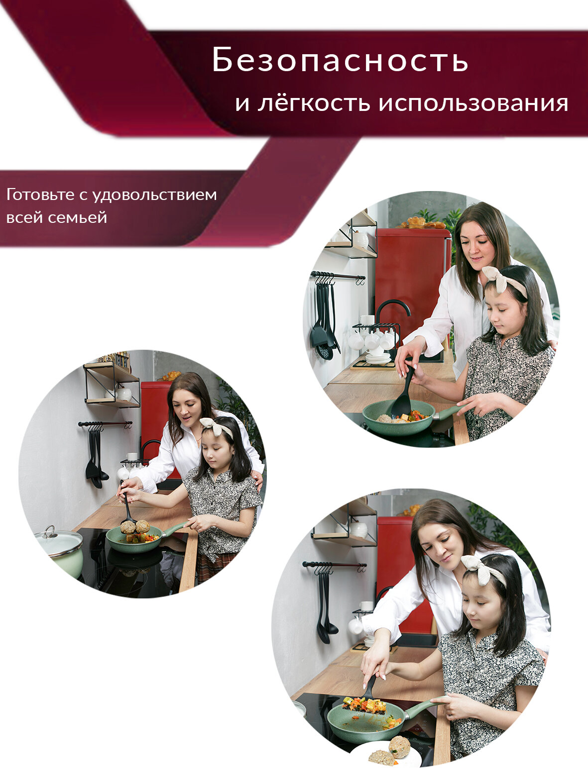 Покупатели экономят 32% стоимости при приобретении комплекта против покупки инструментов по отдельности. Набор совместим со всеми типами посуды: