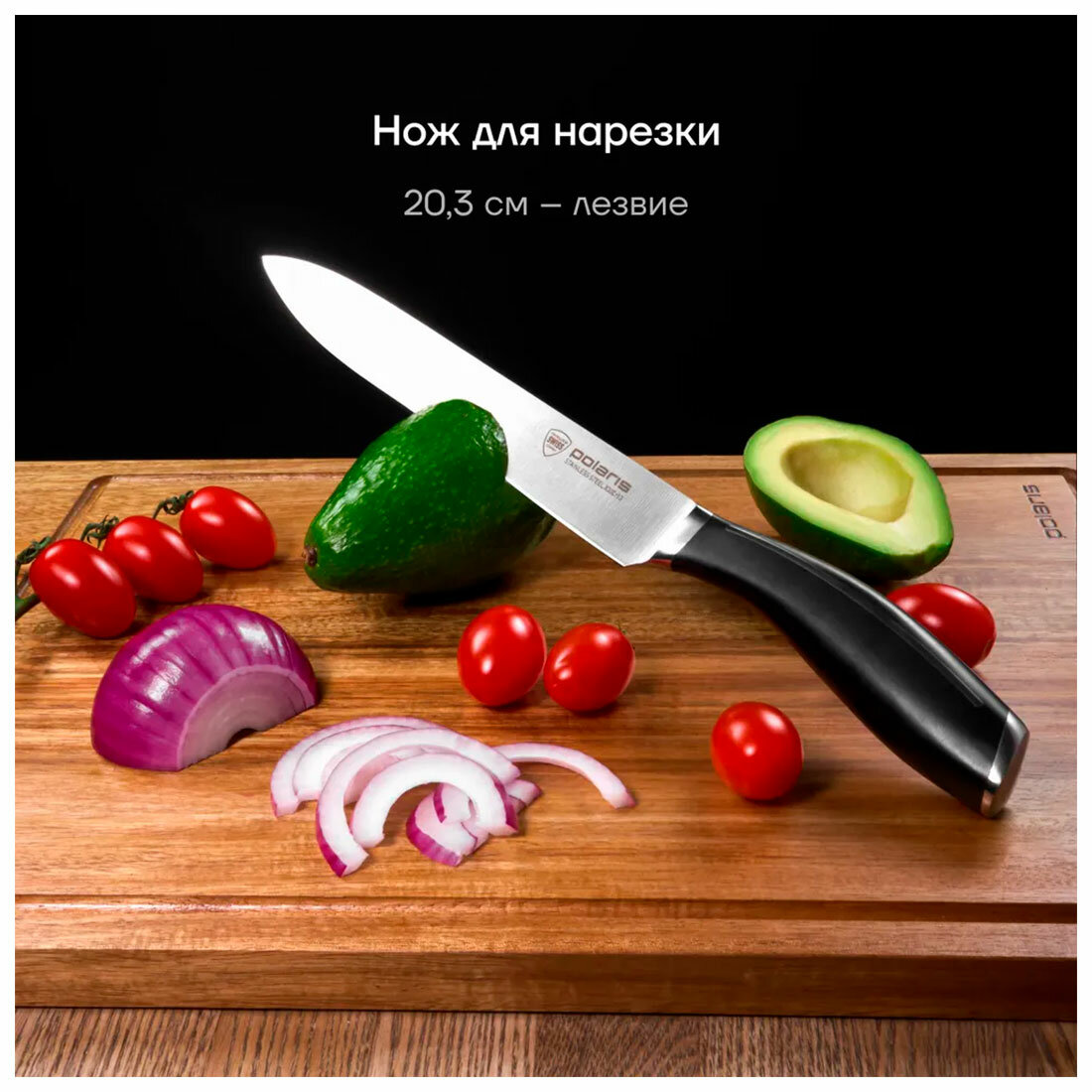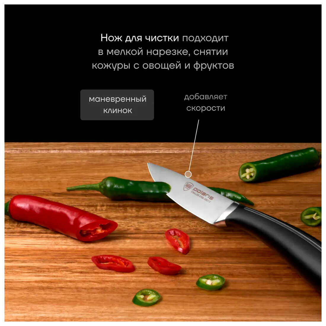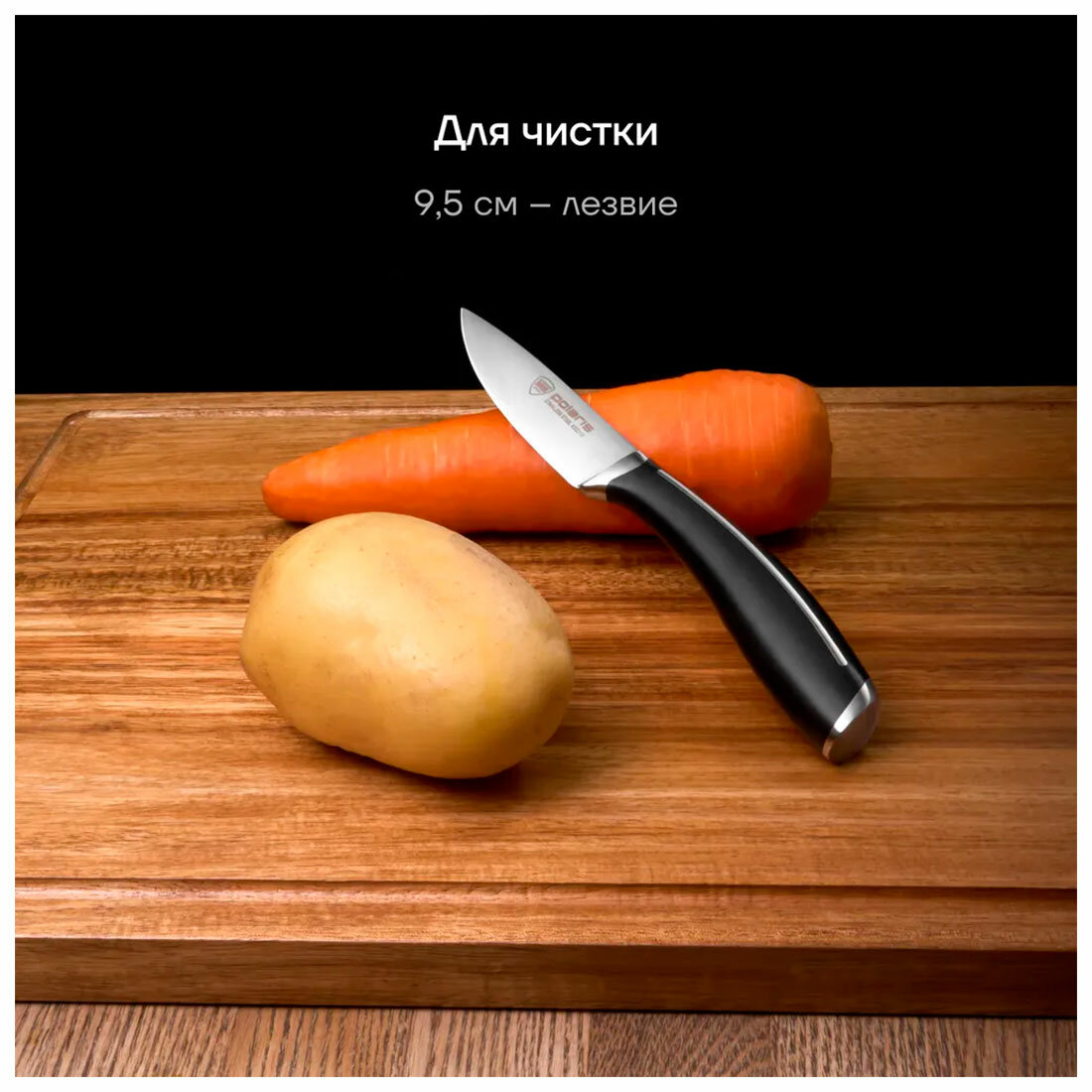 - Дифференцированная длина лезвий: овощной нож 9 см, универсальный 15 см, шеф-нож 20.5 см