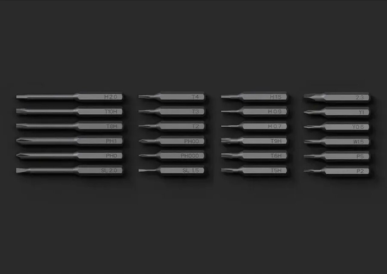 25 элементов включают все распространённые типы шлицев для работы с электроникой, мебелью и бытовой техникой. В набор входят: