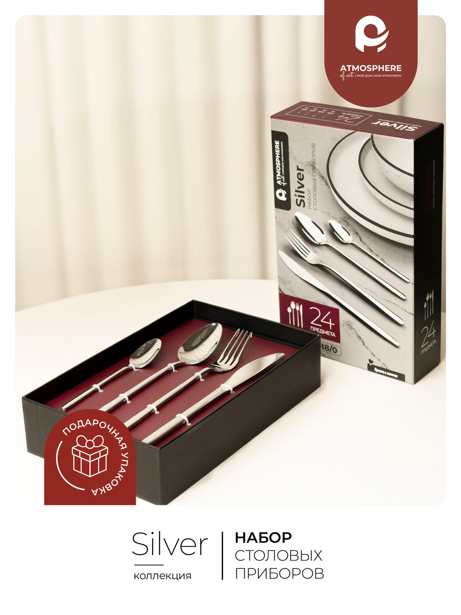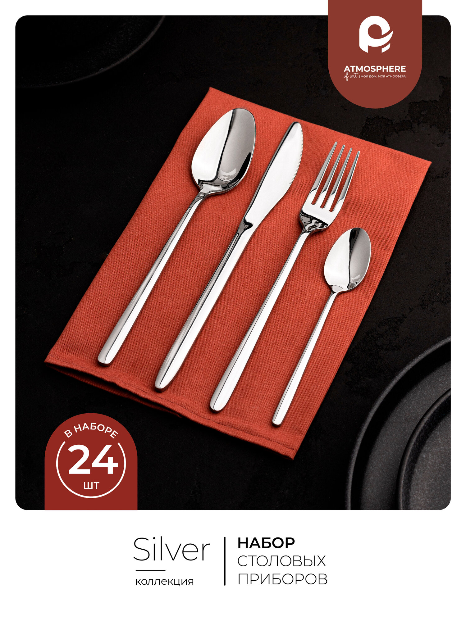 Набор Atmosphere of Art Silver из 24 предметов включает все необходимое для сервировки на 6 персон. В кейс входят: 6 столовых и 6 десертных ложек, 6 вилок для основных блюд, 6 ножей с эргономичными ручками, дополненные ложкой для салата и лопаткой для торта. Каждый элемент выточен из цельного листа хирургической стали 18/10, что гарантирует отсутствие трещин в местах креплений.