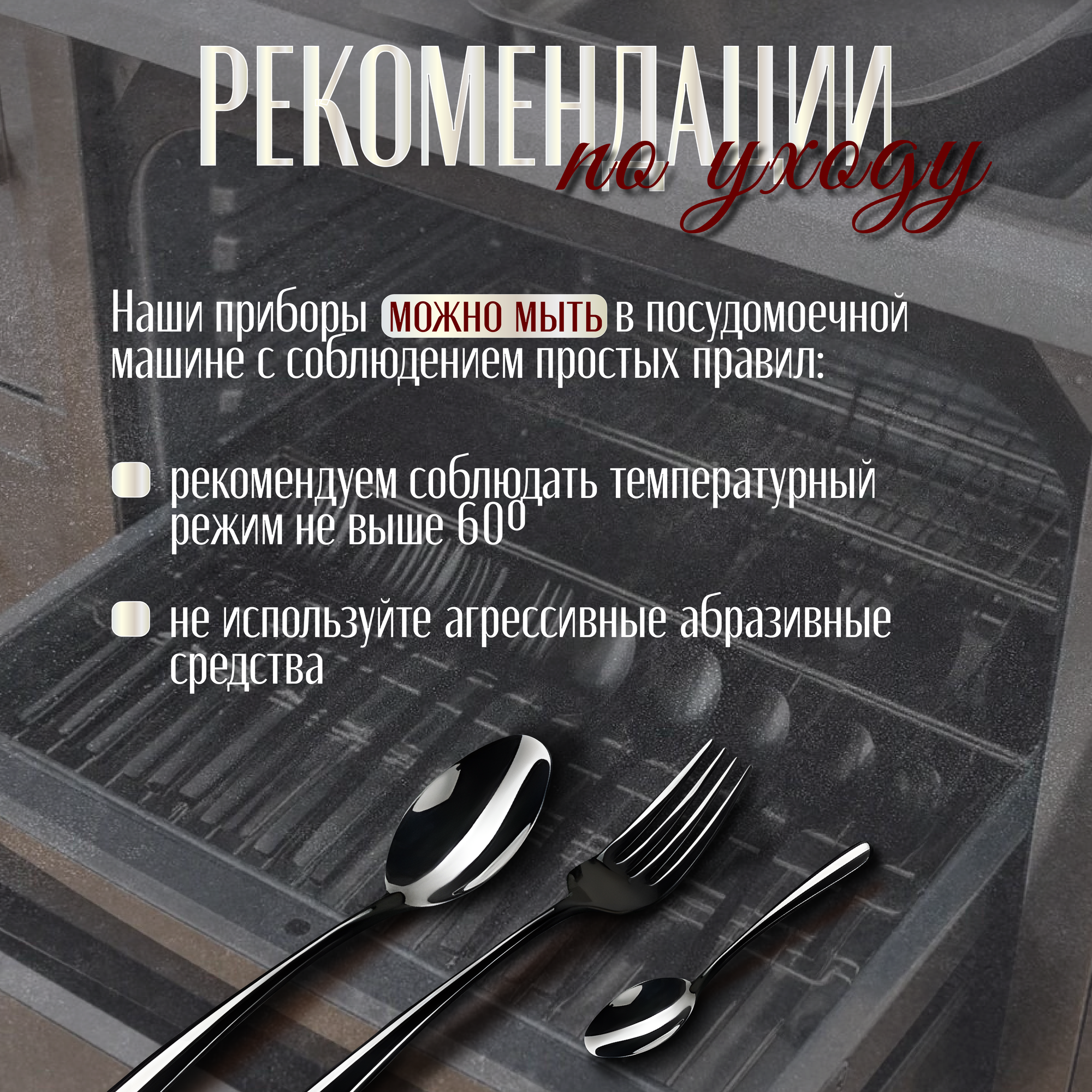 24-предметная конфигурация включает 6 универсальных ножей с двухсторонней заточкой, 6 обеденных вилок с удлиненными зубцами и 12 столовых ложек (основных и десертных). Каждый прибор изготовлен по нормативам пищевой стали марки 18/10 с добавлением хрома для устойчивости к окислению. Покрытие PVD формирует глубокий черный цвет без красителей — технология применяется в профессиональной посуде премиум-сегмента.