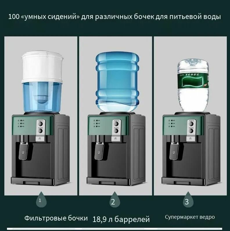 Настольный кулер-диспенсер черного цвета решает 3 основные задачи: охлаждение воды до комнатной температуры, моментальный нагрев до 95°C и удобное хранение бутилированной воды. При весе 1.9 кг устройство легко переносить между кабинетом и кухней, а верхнее расположение бутыли экономит рабочее пространство.
