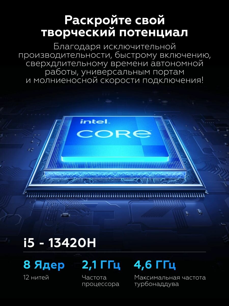 Intel Core i5-13420H показывает впечатляющую производительность в тестах Cinebench R23: 1425 баллов в однопоточном и 9860 в многопоточном режиме. Гибридная архитектура из 4 производительных и 4 энергоэффективных ядер оптимально распределяет задачи между 8 потоками. При повседневном использовании это означает: