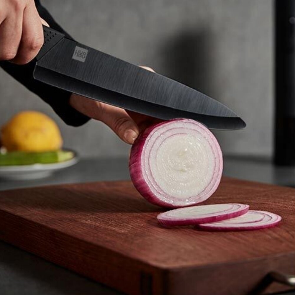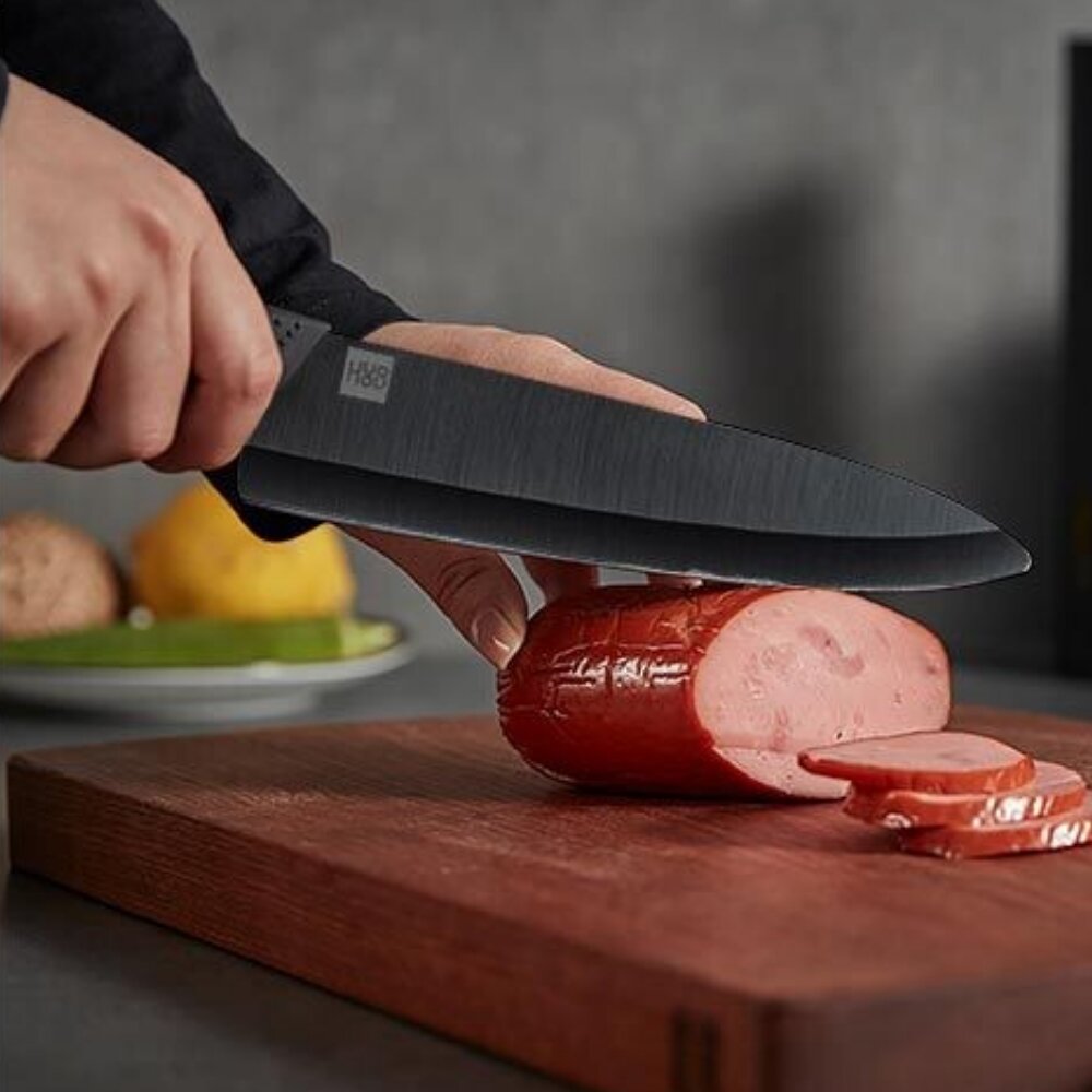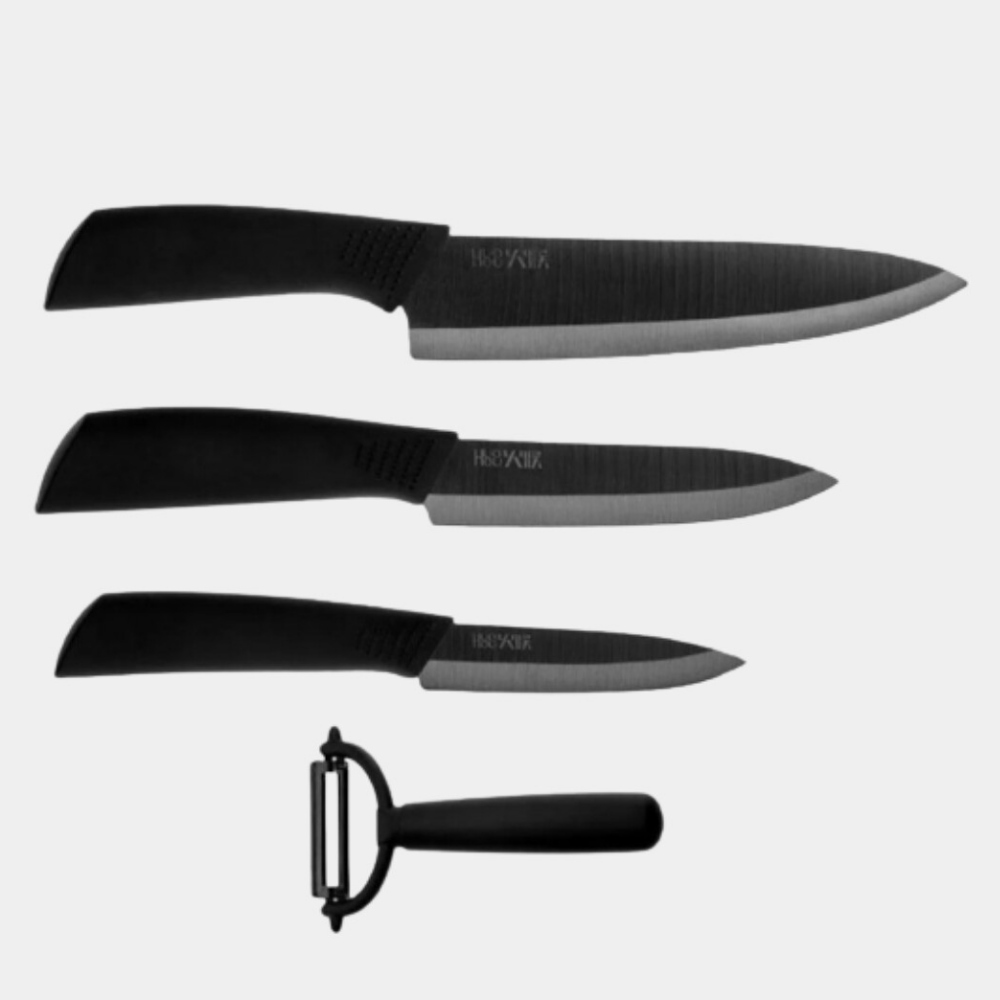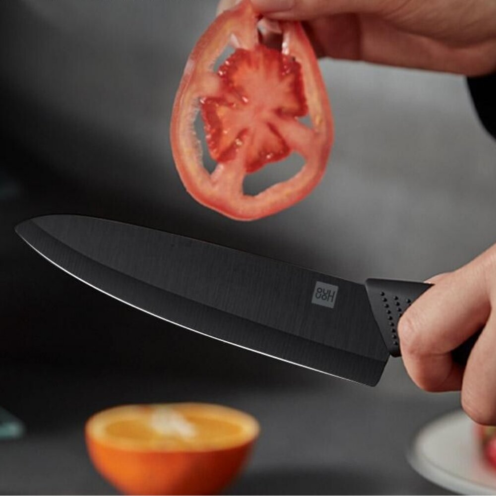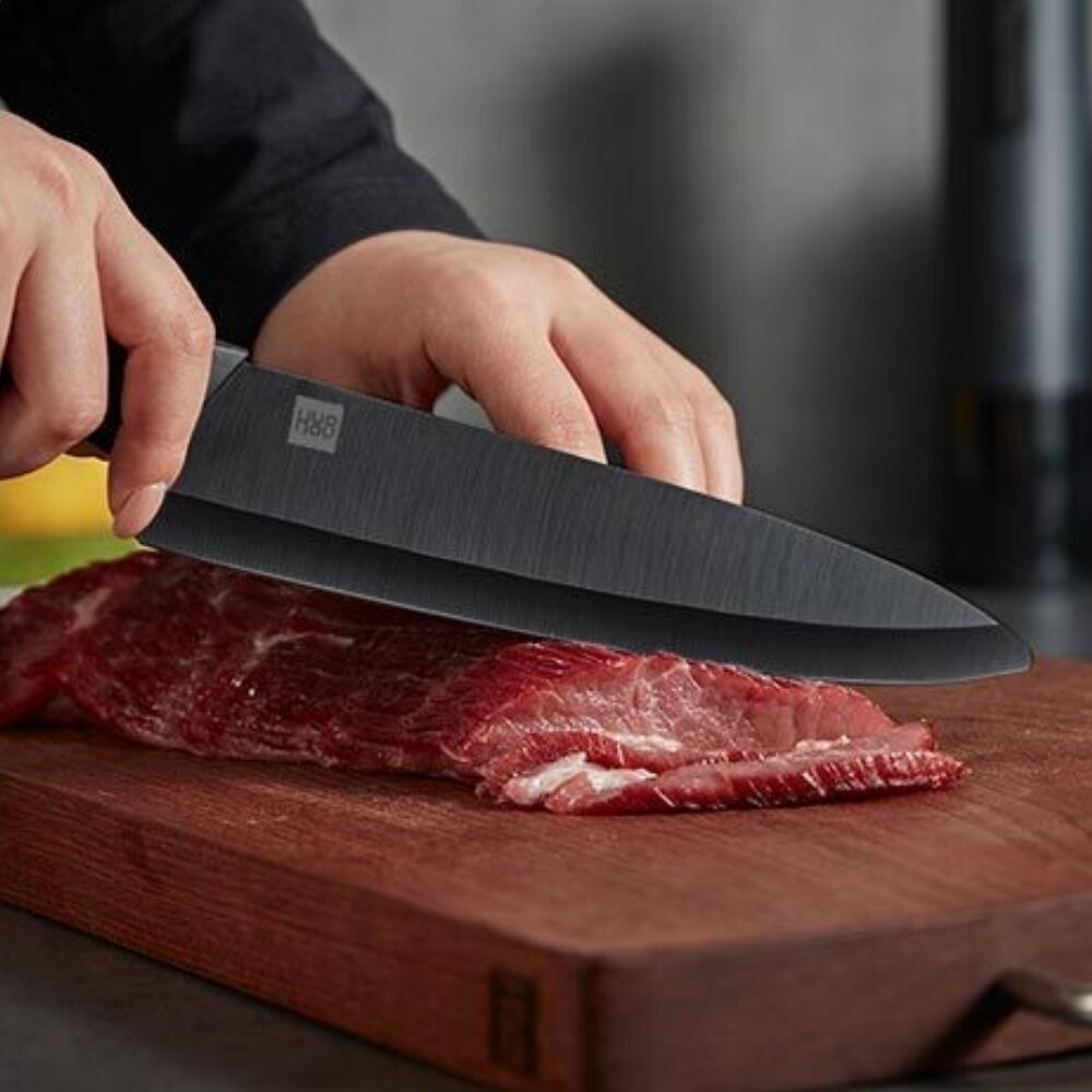 ΠΠ°Π±ΠΎΡ HuoHou Nano Ceramic Knife HU0010 Π²ΠΊΠ»ΡΡΠ°Π΅Ρ ΡΡΠΈ Π½ΠΎΠΆΠ° ΡΠ°Π·Π½ΠΎΠ³ΠΎ ΡΠ°Π·ΠΌΠ΅ΡΠ° (16 ΡΠΌ, 18 ΡΠΌ, 21 ΡΠΌ) ΠΈ ΡΡΠ³ΠΎΠ½ΠΎΠΌΠΈΡΠ½ΡΡ ΠΎΠ²ΠΎΡΠ΅ΡΠΈΡΡΠΊΡ. ΠΠ΅Π·Π²ΠΈΡ ΠΈΠ·Π³ΠΎΡΠΎΠ²Π»Π΅Π½Ρ ΠΌΠ΅ΡΠΎΠ΄ΠΎΠΌ ΡΠΏΠ΅ΠΊΠ°Π½ΠΈΡ Π½Π°Π½ΠΎΠΊΠ΅ΡΠ°ΠΌΠΈΠΊΠΈ Π½Π° ΠΎΡΠ½ΠΎΠ²Π΅ Π΄ΠΈΠΎΠΊΡΠΈΠ΄Π° ΡΠΈΡΠΊΠΎΠ½ΠΈΡ β ΠΌΠ°ΡΠ΅ΡΠΈΠ°Π»Π° Ρ ΡΠ²Π΅ΡΠ΄ΠΎΡΡΡΡ 85 HRC ΠΏΠΎ ΡΠΊΠ°Π»Π΅ Π ΠΎΠΊΠ²Π΅Π»Π»Π°. ΠΠ»Ρ ΡΡΠ°Π²Π½Π΅Π½ΠΈΡ: ΠΎΠ±ΡΡΠ½ΡΠ΅ ΡΡΠ°Π»ΡΠ½ΡΠ΅ Π»Π΅Π·Π²ΠΈΡ ΠΈΠΌΠ΅ΡΡ 55-60 HRC.