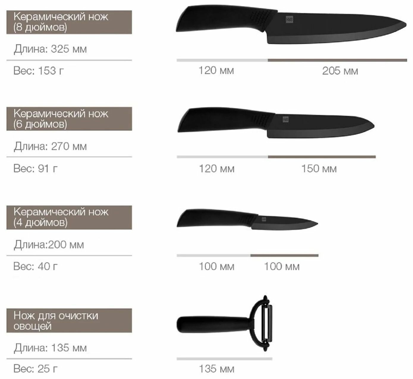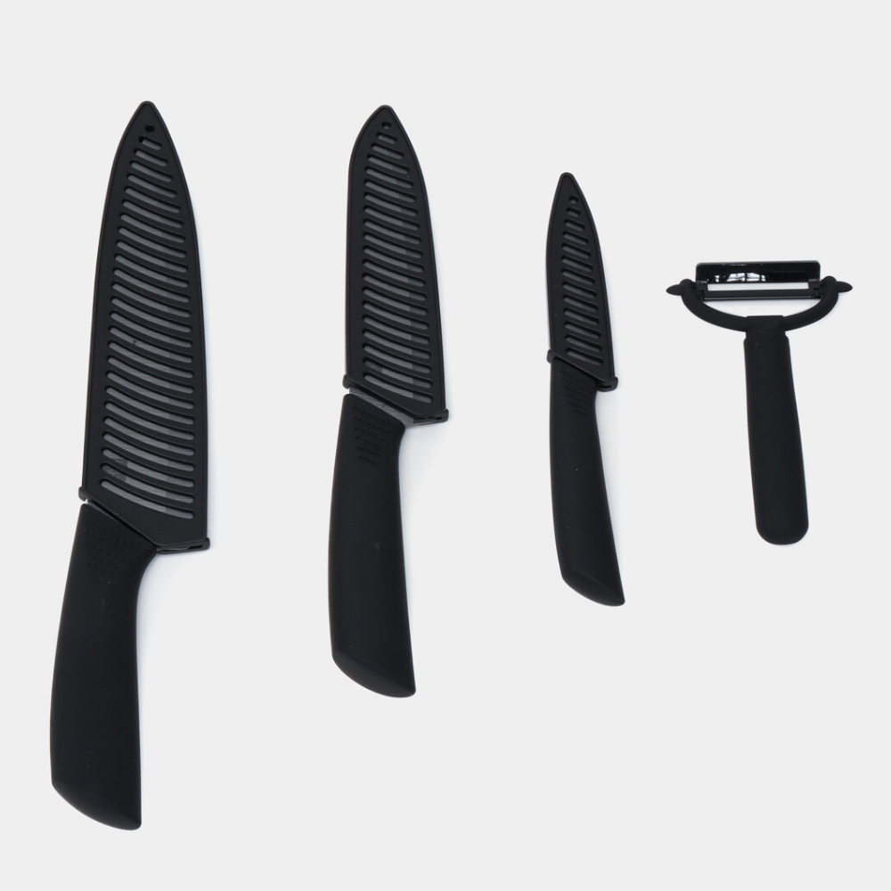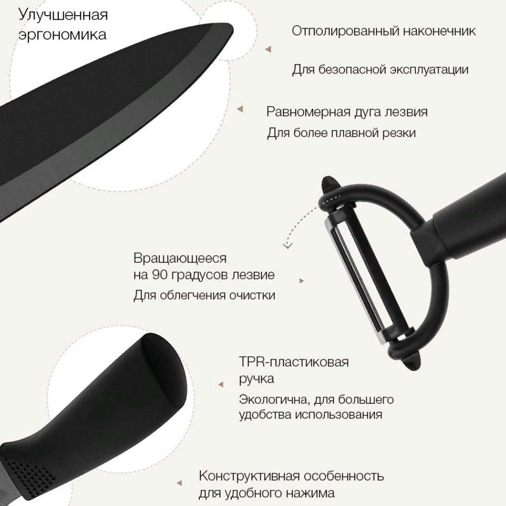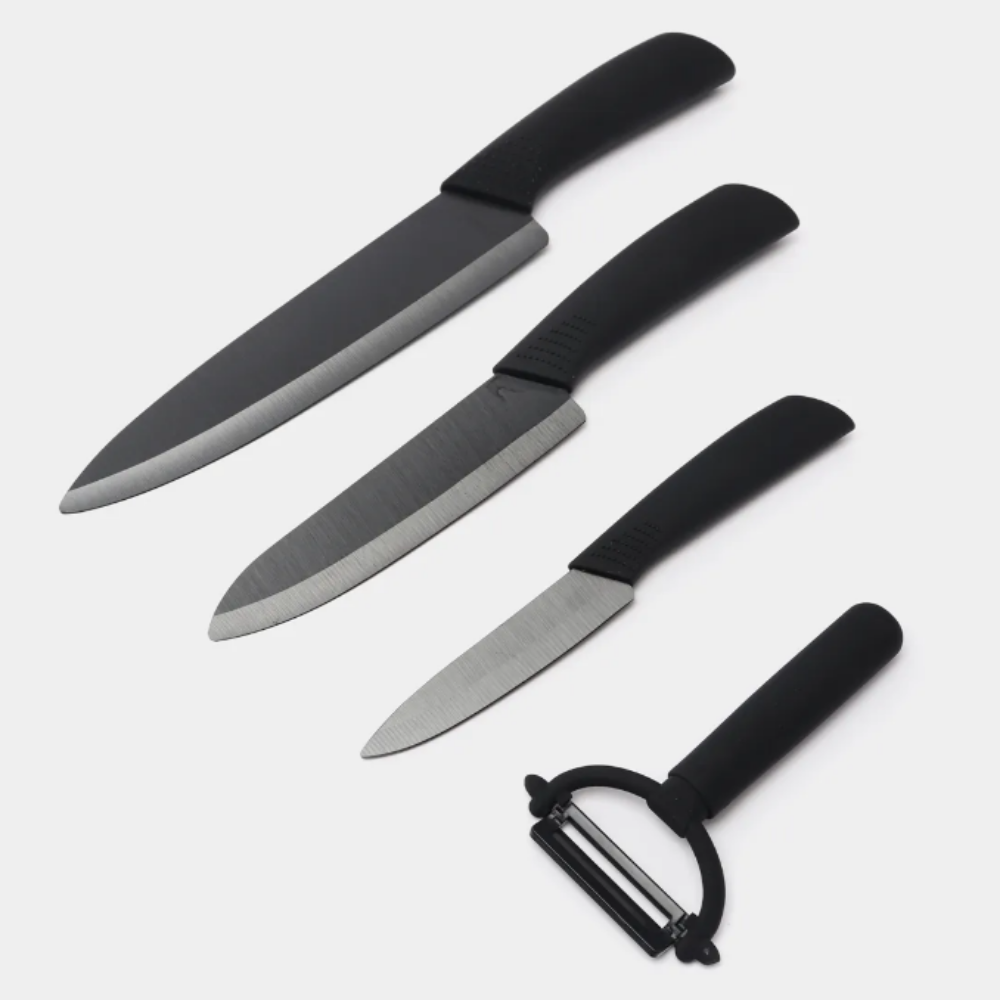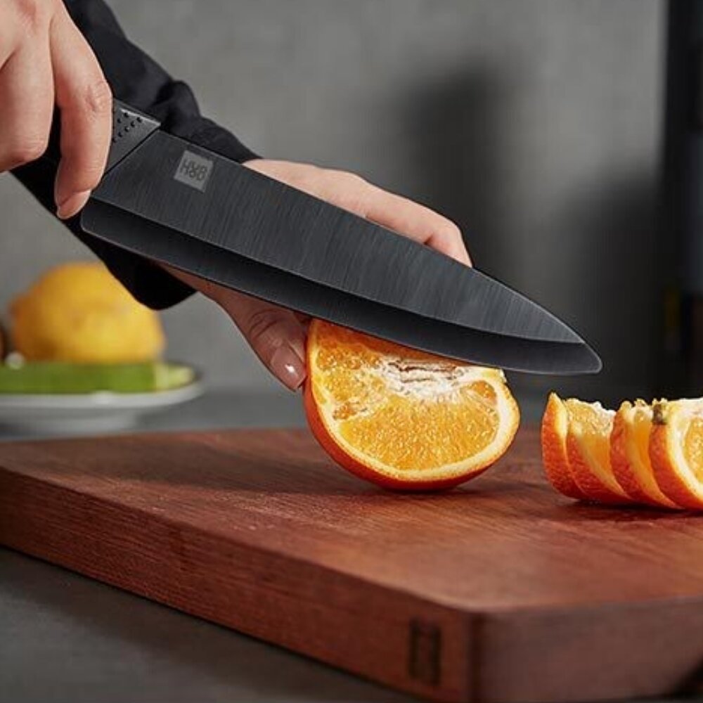 ΠΠ°Π±ΠΎΡ HuoHou Nano Ceramic Knife HU0010 Π²ΠΊΠ»ΡΡΠ°Π΅Ρ ΡΡΠΈ Π½ΠΎΠΆΠ° ΡΠ°Π·Π½ΠΎΠ³ΠΎ ΡΠ°Π·ΠΌΠ΅ΡΠ° (16 ΡΠΌ, 18 ΡΠΌ, 21 ΡΠΌ) ΠΈ ΡΡΠ³ΠΎΠ½ΠΎΠΌΠΈΡΠ½ΡΡ ΠΎΠ²ΠΎΡΠ΅ΡΠΈΡΡΠΊΡ. ΠΠ΅Π·Π²ΠΈΡ ΠΈΠ·Π³ΠΎΡΠΎΠ²Π»Π΅Π½Ρ ΠΌΠ΅ΡΠΎΠ΄ΠΎΠΌ ΡΠΏΠ΅ΠΊΠ°Π½ΠΈΡ Π½Π°Π½ΠΎΠΊΠ΅ΡΠ°ΠΌΠΈΠΊΠΈ Π½Π° ΠΎΡΠ½ΠΎΠ²Π΅ Π΄ΠΈΠΎΠΊΡΠΈΠ΄Π° ΡΠΈΡΠΊΠΎΠ½ΠΈΡ β ΠΌΠ°ΡΠ΅ΡΠΈΠ°Π»Π° Ρ ΡΠ²Π΅ΡΠ΄ΠΎΡΡΡΡ 85 HRC ΠΏΠΎ ΡΠΊΠ°Π»Π΅ Π ΠΎΠΊΠ²Π΅Π»Π»Π°. ΠΠ»Ρ ΡΡΠ°Π²Π½Π΅Π½ΠΈΡ: ΠΎΠ±ΡΡΠ½ΡΠ΅ ΡΡΠ°Π»ΡΠ½ΡΠ΅ Π»Π΅Π·Π²ΠΈΡ ΠΈΠΌΠ΅ΡΡ 55-60 HRC.