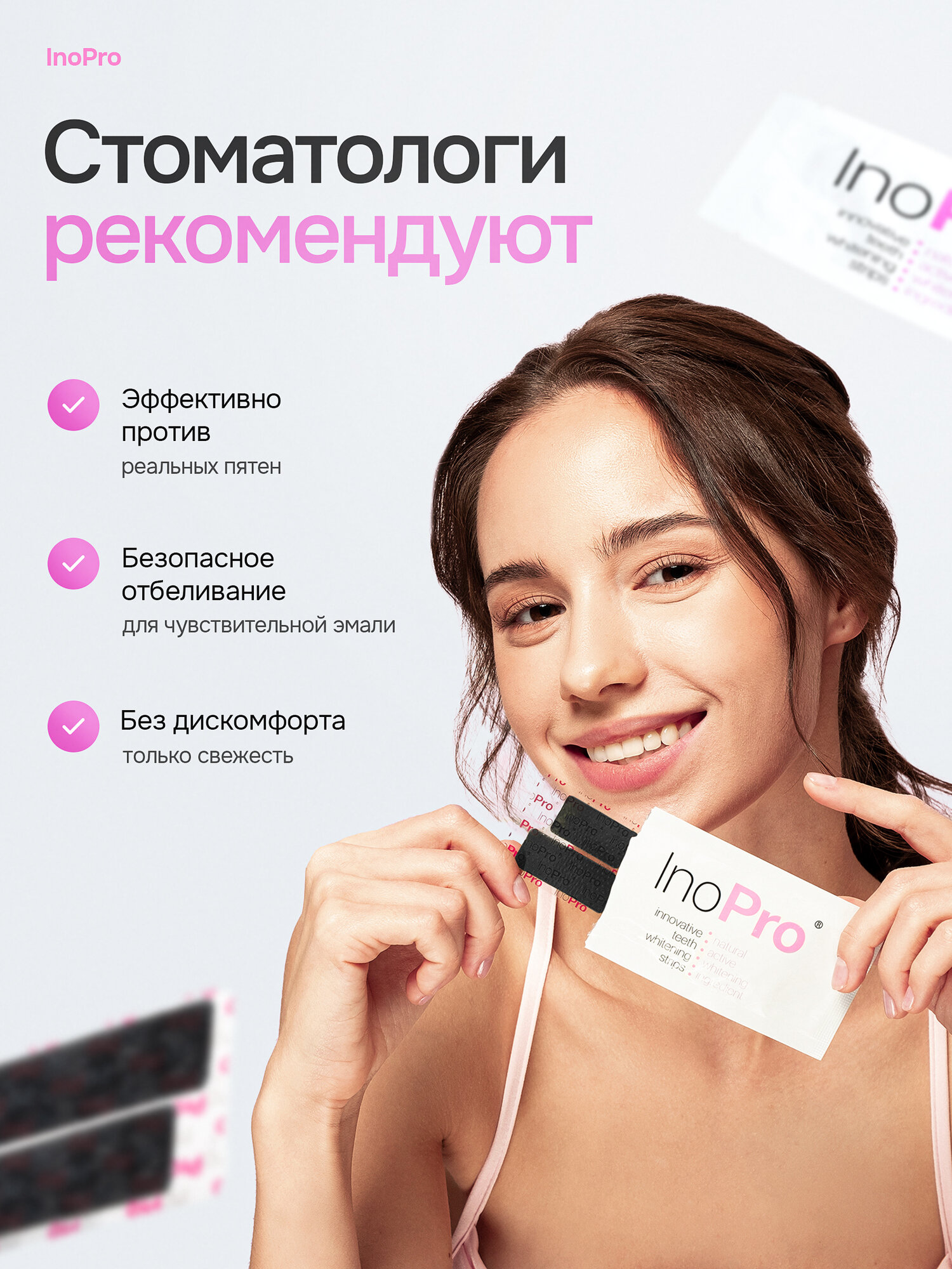 Отбеливающие полоски InoPro созданы специально для обладателей чувствительных зубов с индивидуальной реакцией на химические компоненты. Состав исключает 12 потенциальных раздражителей: