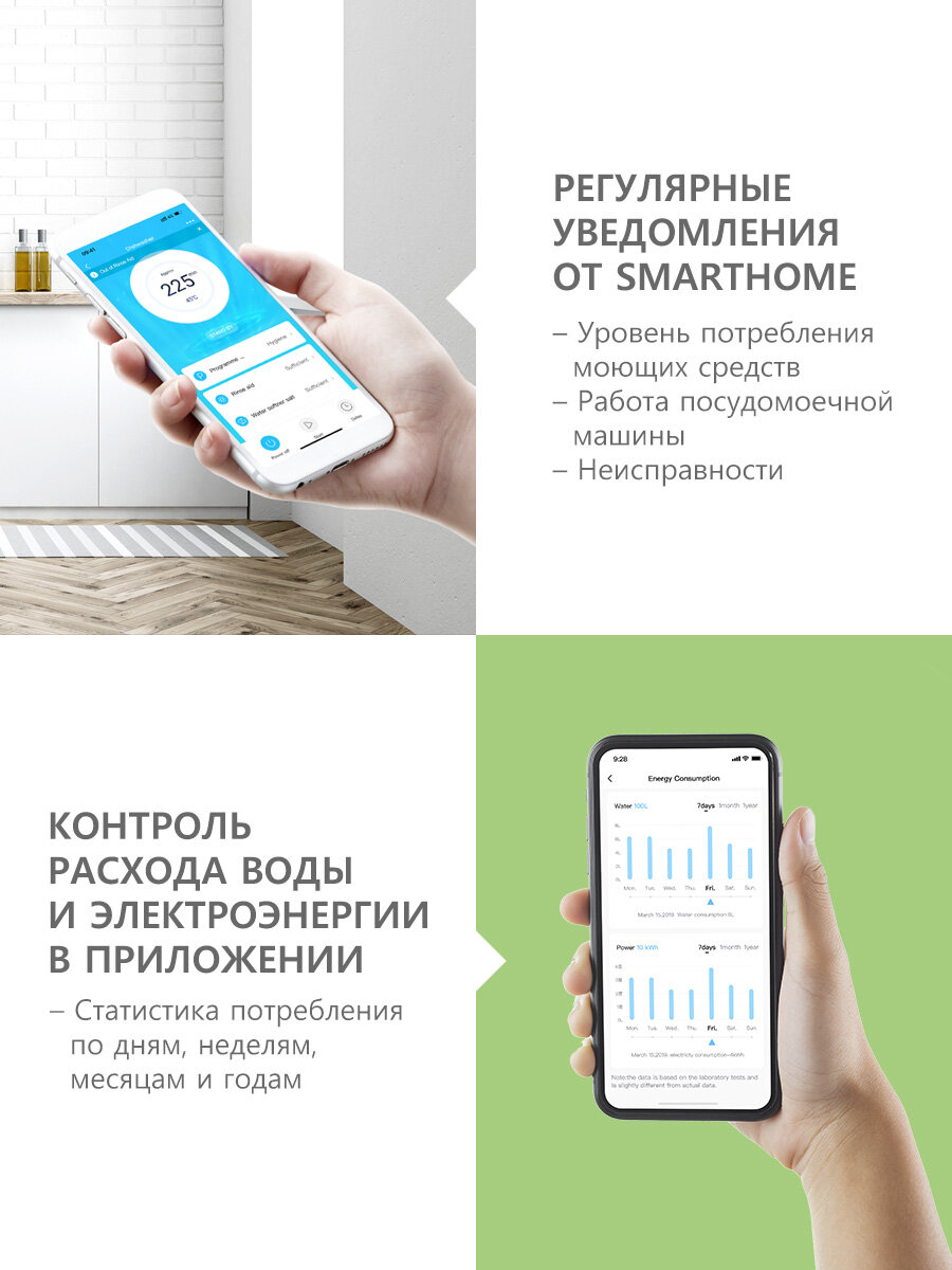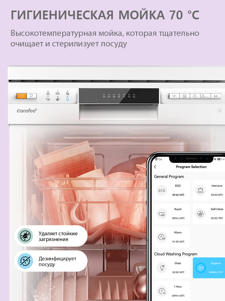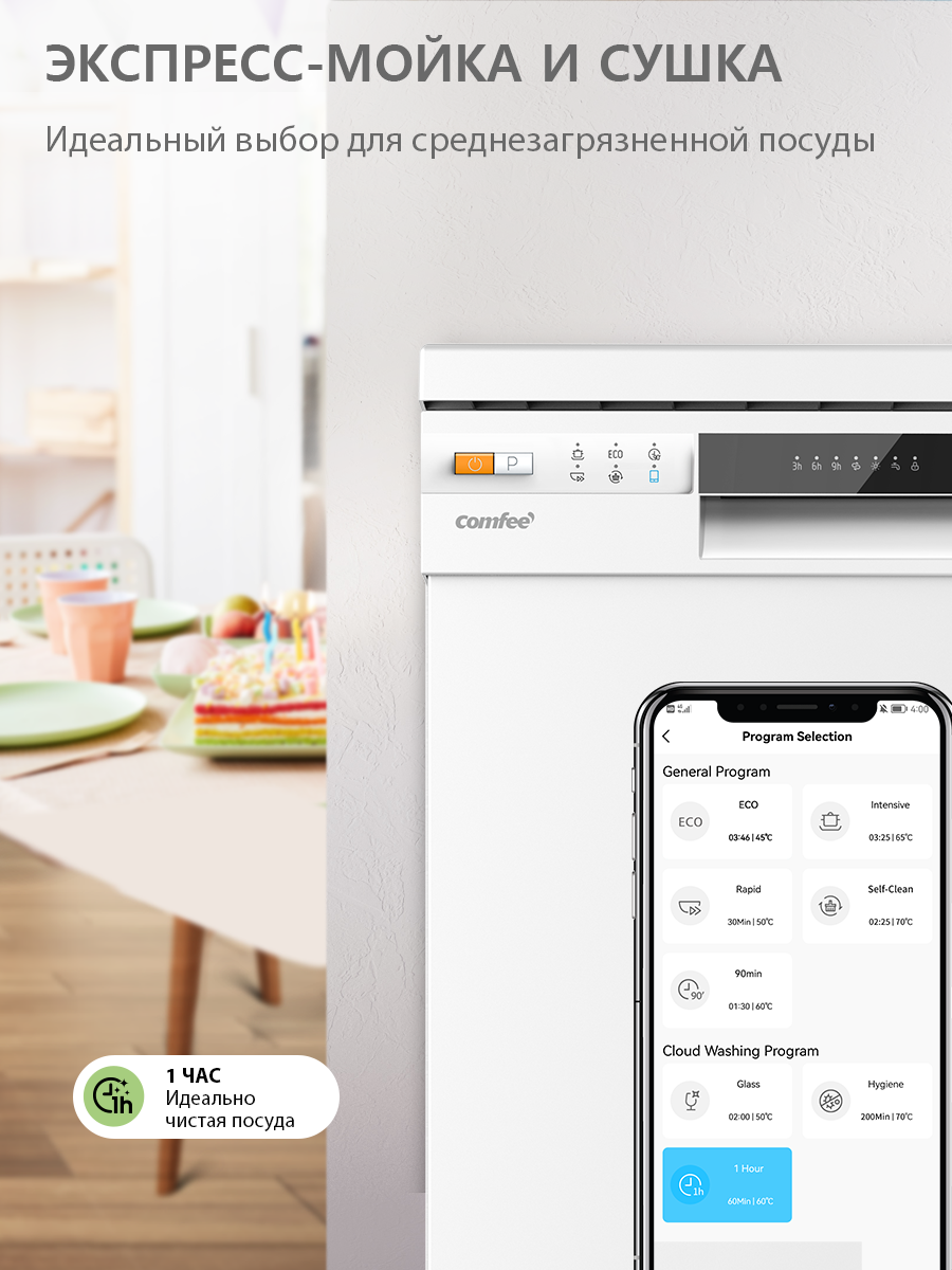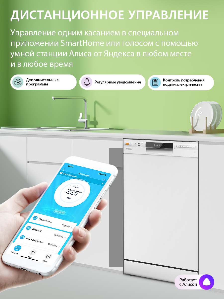 Wi-Fi модуль в Comfee CDW452Wi синхронизируется со смартфонами на iOS/Android через приложение Midea Home. Функции удалённого контроля: