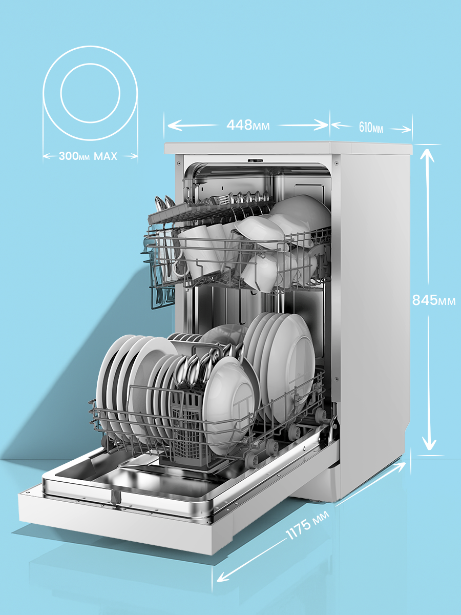 Компактный корпус 44.8 см в ширину позволяет разместить технику даже в малогабаритных кухнях-нишах. При стандартной высоте 85 см и глубине 60 см машина вмещает 10 комплектов посуды за один цикл — достаточно для семьи из 4-5 человек: