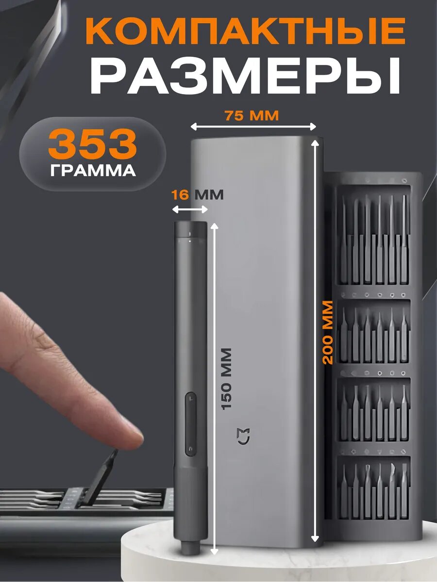 Xiaomi Mijia Electric Screwdriver сочетает компактность профессионального инструмента с возможностями бытового прибора. При весе 400 г и длине 159 мм устройство легко удерживается одной рукой во время работы с мебелью или электроникой: