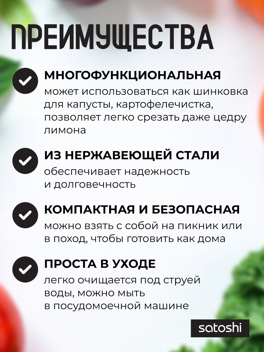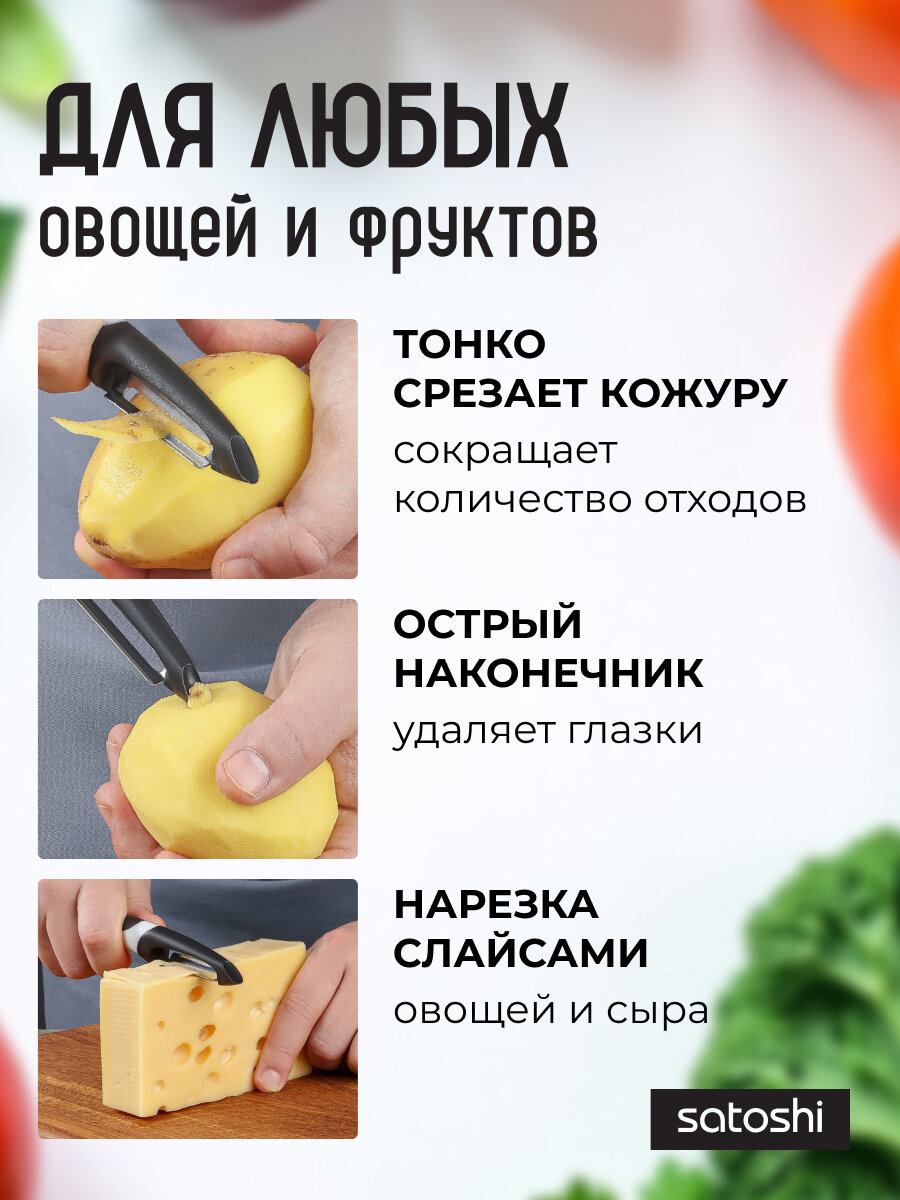 Овощечистка SATOSHI создана для профессиональной обработки продуктов. Ее лезвие из нержавеющей стали AISI 420 сохраняет остроту при чистке 50 кг корнеплодов - это подтверждено испытаниями Института пищевых технологий (ИПТ). Покрытие SteelShield предотвращает коррозию даже при использовании в морской воде.