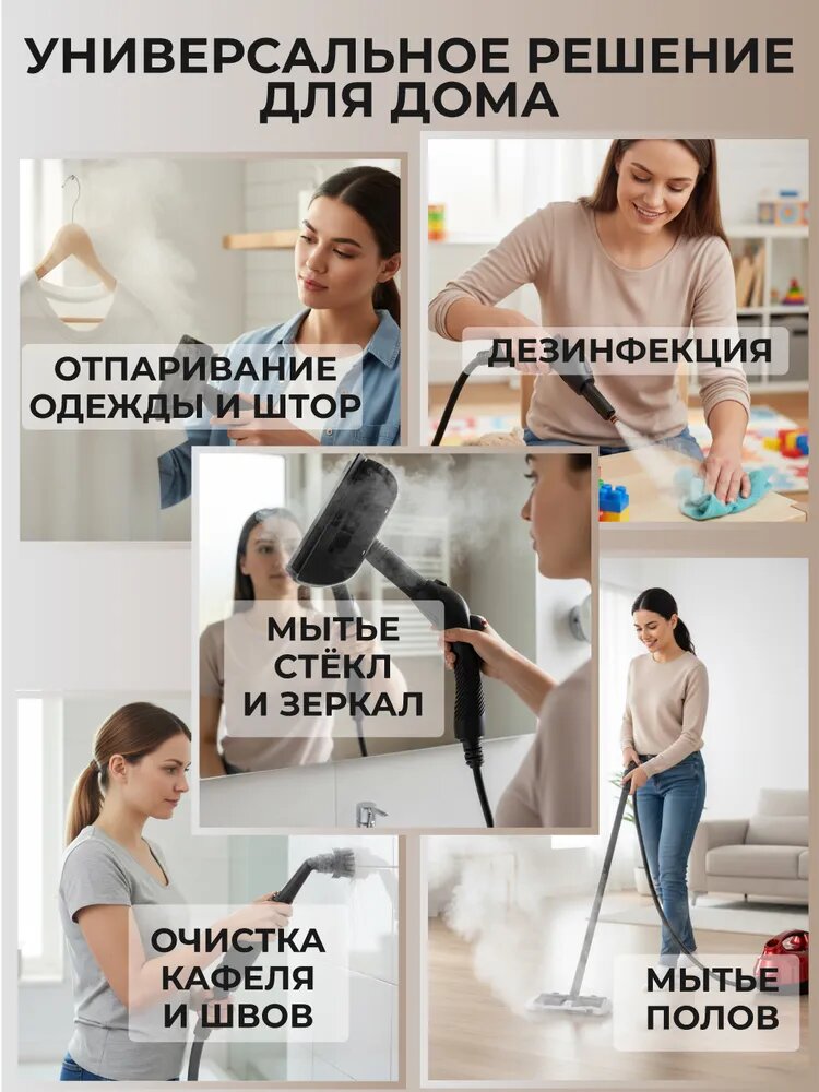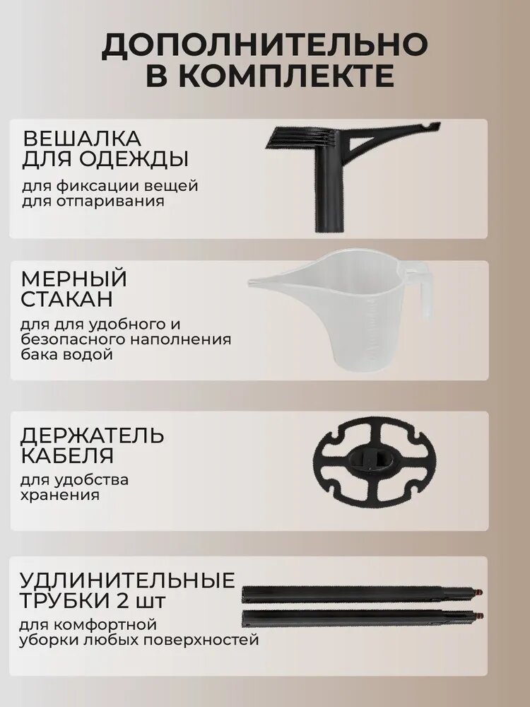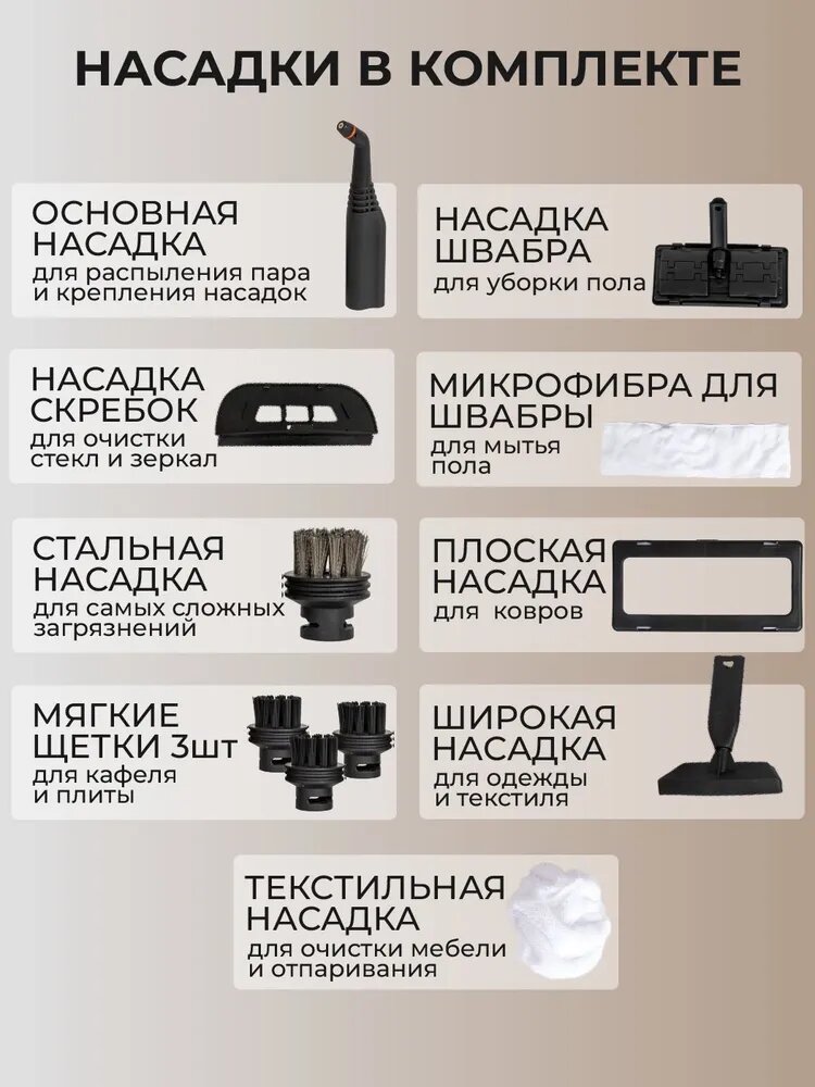 - 11 профессиональных насадок включают щелевой очиститель для межплиточных швов, круглый скребок для окон и текстильную насадку с защитой от ожогов