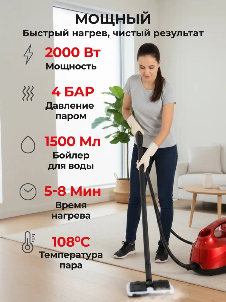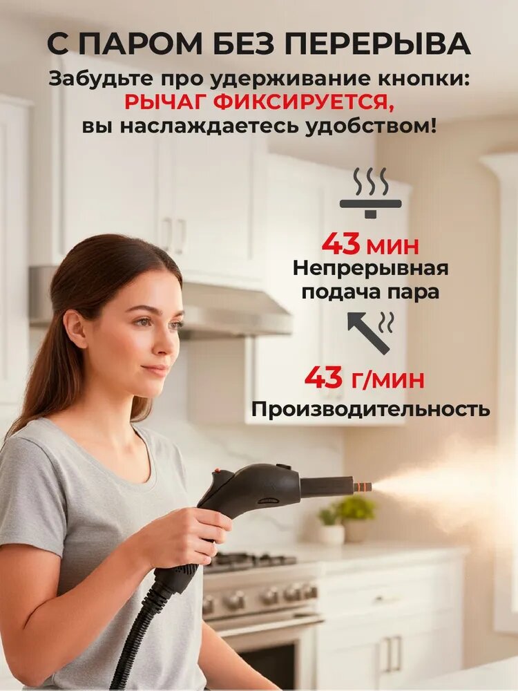 Датчик SmartSteam оптимизирует расход пара — при обработке вертикальных поверхностей (окна, двери) автоматически увеличивает давление, сокращая время работы на 22%. Расчет для стандартной квартиры 65 м²: