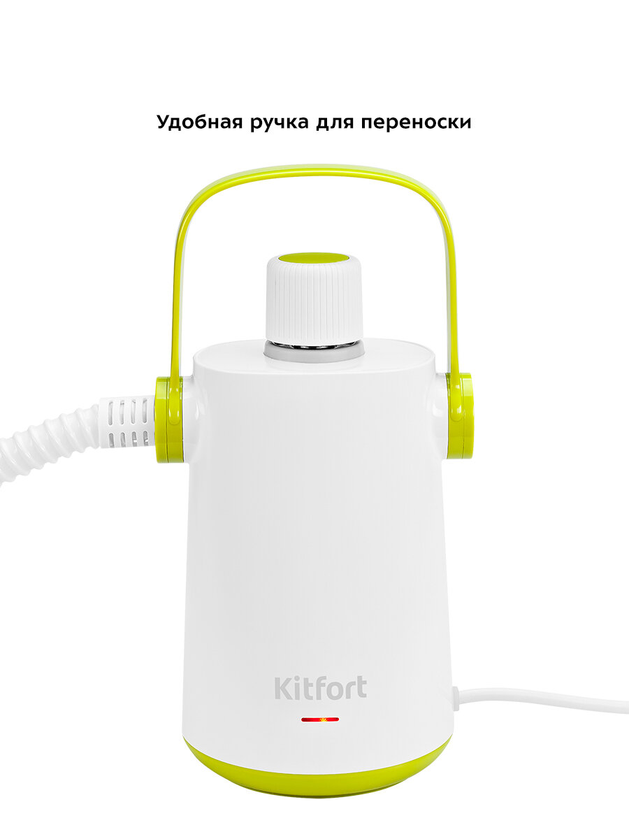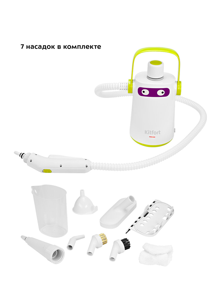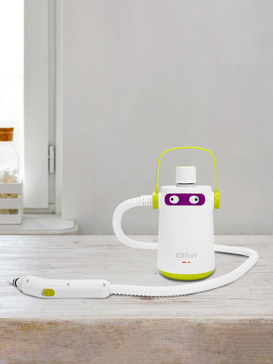 Паровой очиститель Kitfort КТ-9109-2 демонстрирует производительность профессиональной техники в бытовом форм-факторе. Создавая давление 3 бар при мощности 1000 Вт, прибор формирует плотный паровой луч, способный: