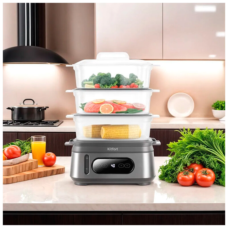 Электрическая пароварка Kitfort KT-6280 мощностью 1050 Вт готовит блюда на 20% быстрее аналогов с 800 Вт благодаря оптимизированной системе парообразования. В базовую комплектацию входят: