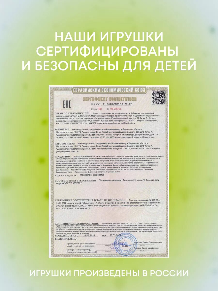 Игрушка соответствует профильным стандартам, подтверждённым испытательными лабораториями: