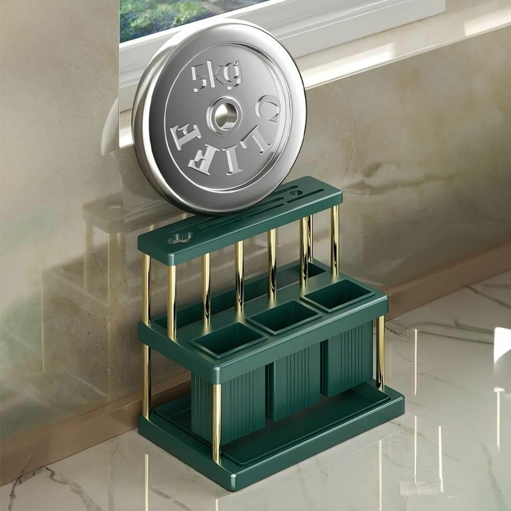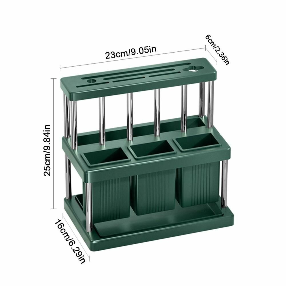 Основание с антискользящим покрытием обеспечивает устойчивость даже на мокрых поверхностях, а специальные резиновые ножки предотвращают царапание столешницы. Корпус изготовлен из ударопрочного пластика, а стальные держатели гарантируют надежную фиксацию острых предметов.