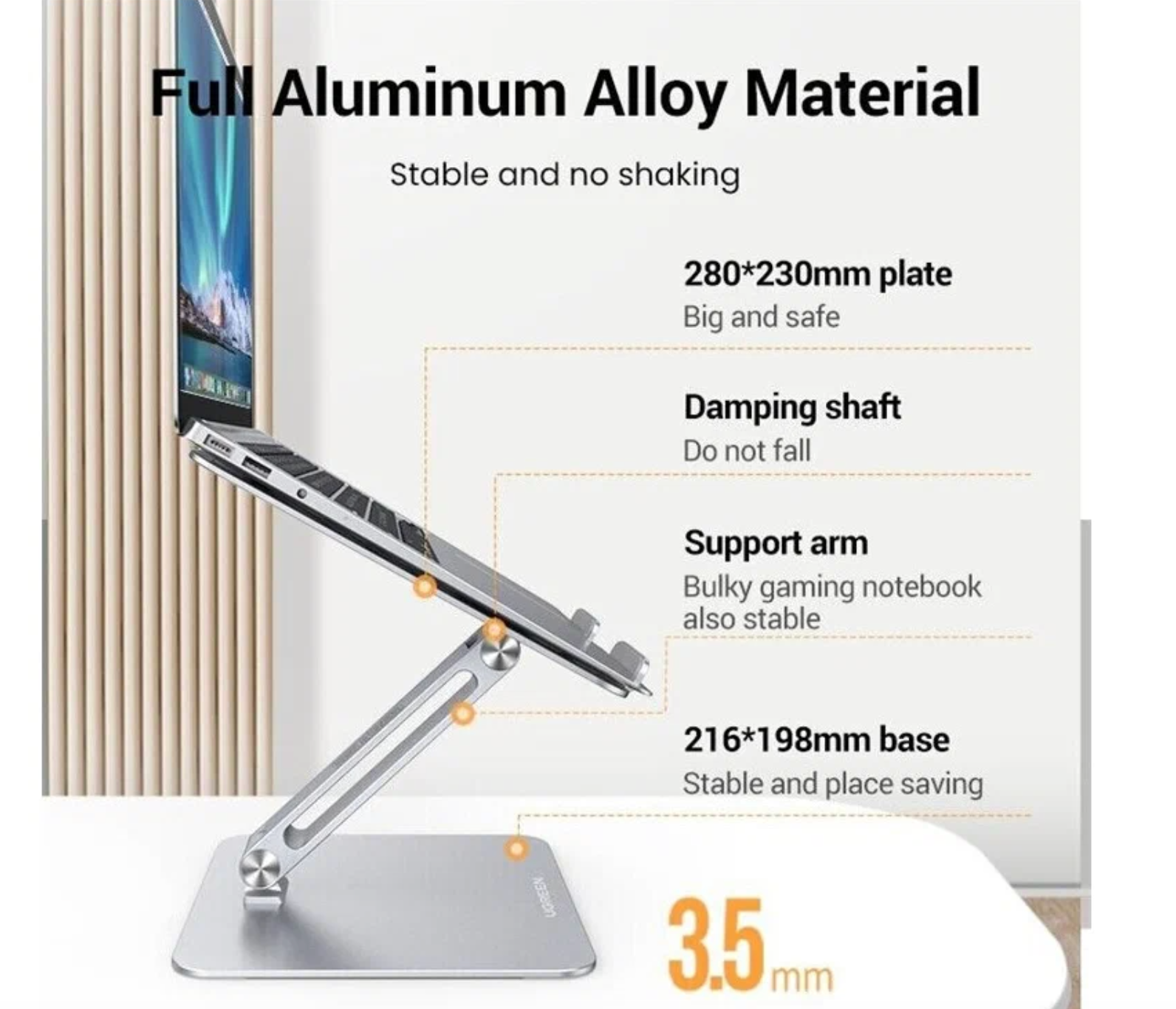 Алюминиевая подставка UGreen LP339 с максимальной нагрузкой 8 кг рассчитана на современные игровые и профессиональные ноутбуки. При ширине платформы 28 см конструкция стабильно поддерживает устройства: