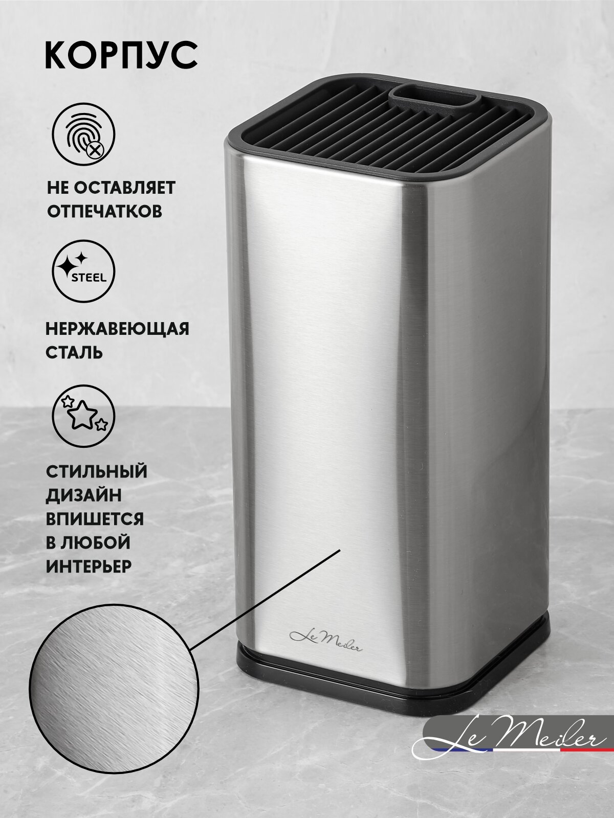Подставка для ножей Le Meiler HM-001 из пищевой нержавеющей стали AISI 304 решает проблему хаотичного хранения режущих инструментов. 10 вертикальных секций с защищёнными бортами предотвращают соприкосновение лезвий между собой: