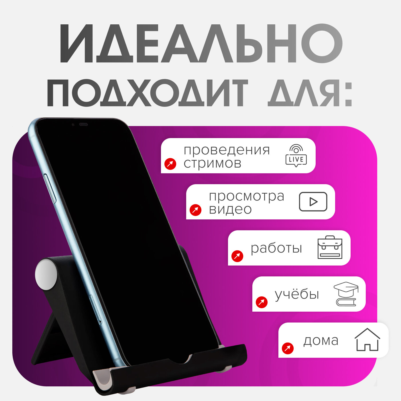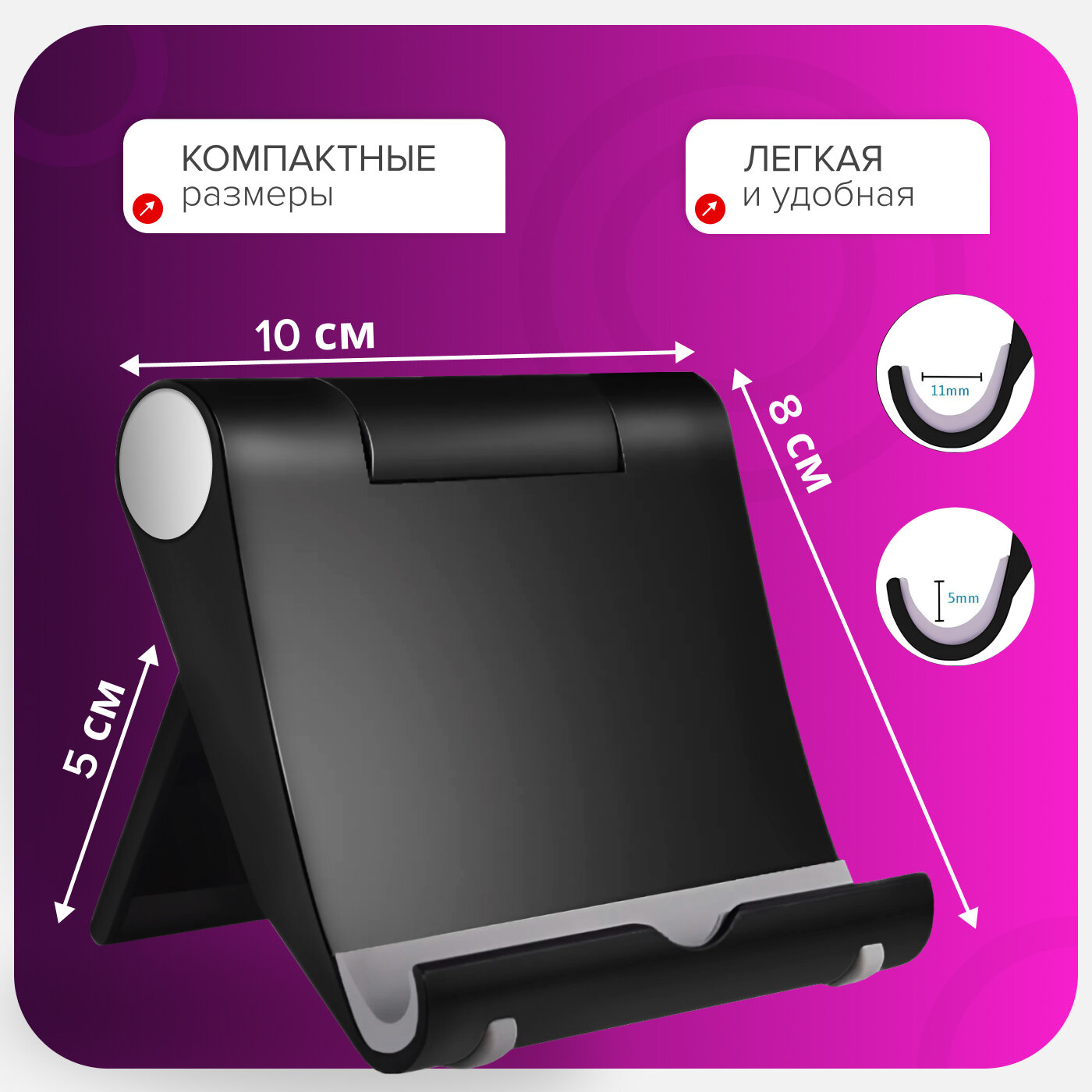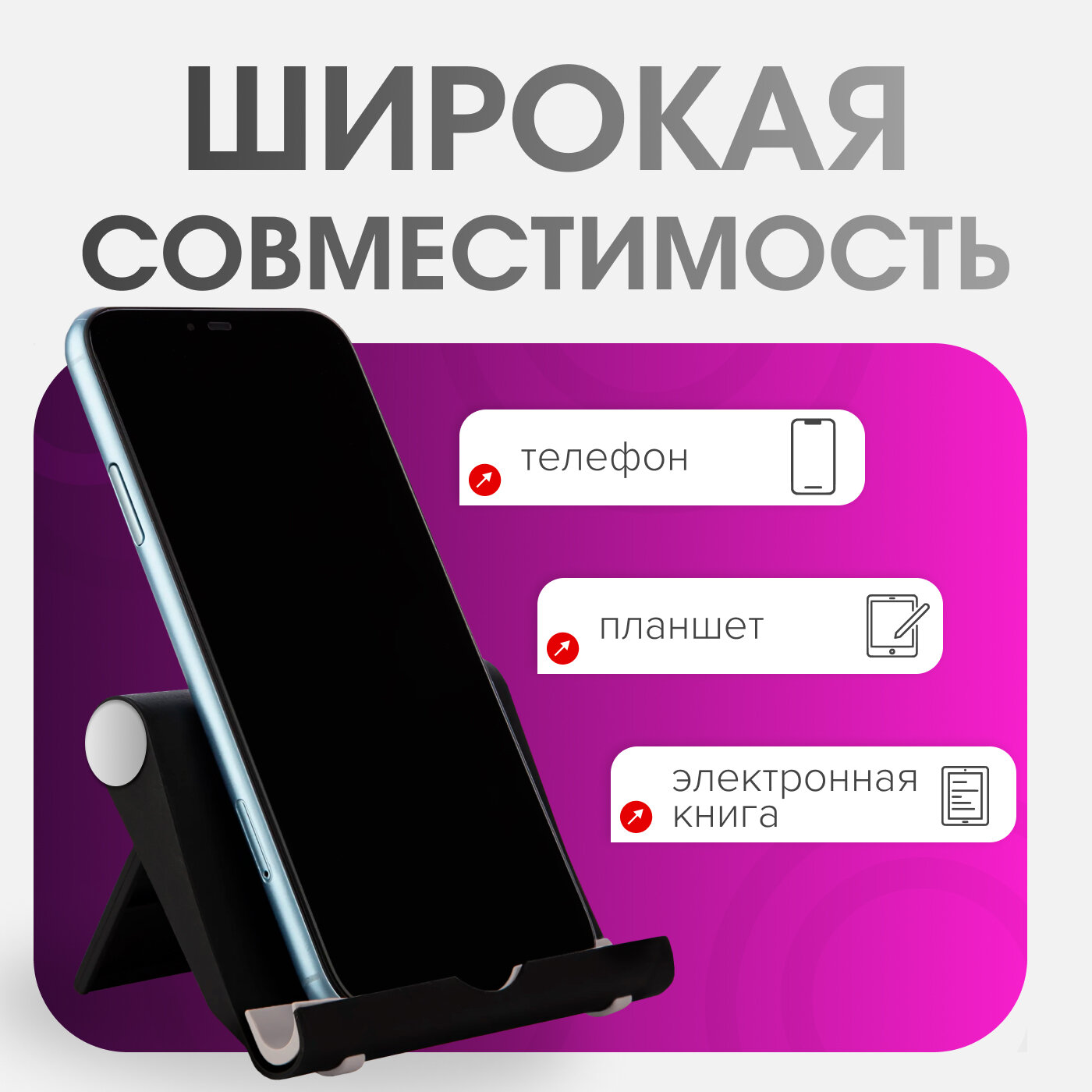 Подходит для смартфонов (4-7.5"), планшетов (до 12.9") и электронных книг диагональю до 15". Особенности совместимости: