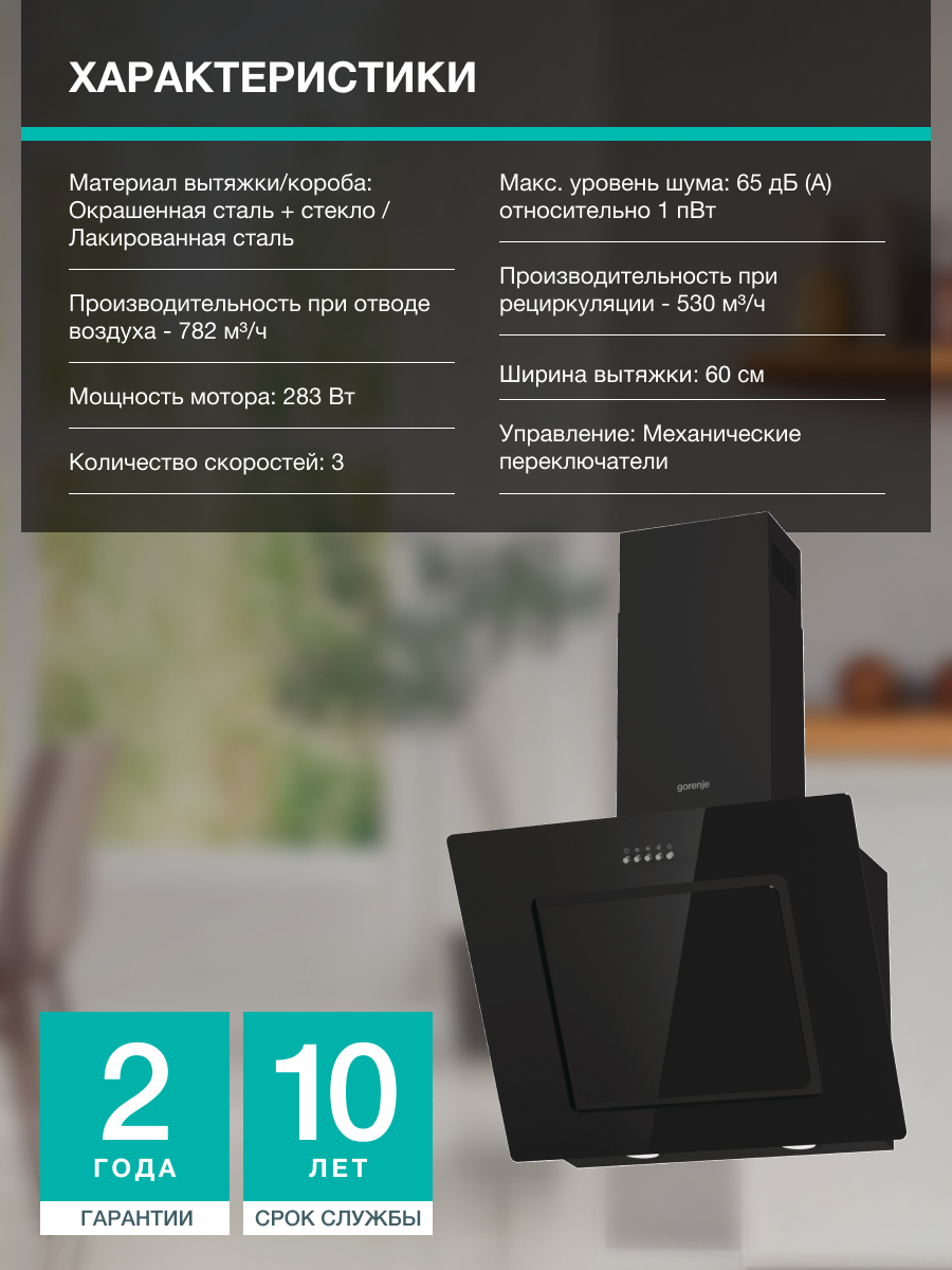 Подвесная конструкция Gorenje WHI626E7B с одним двигателем мощностью 283 Вт обеспечивает производительность 782 м³/час в режиме максимальной нагрузки. Особенности системы: