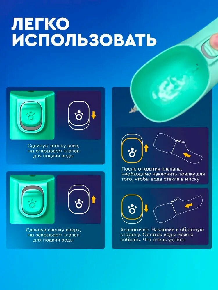 Упрощённая очистка за счёт съёмных компонентов и широкого горлышка (диаметром 7 см). Инструкция от ветеринаров рекомендует: