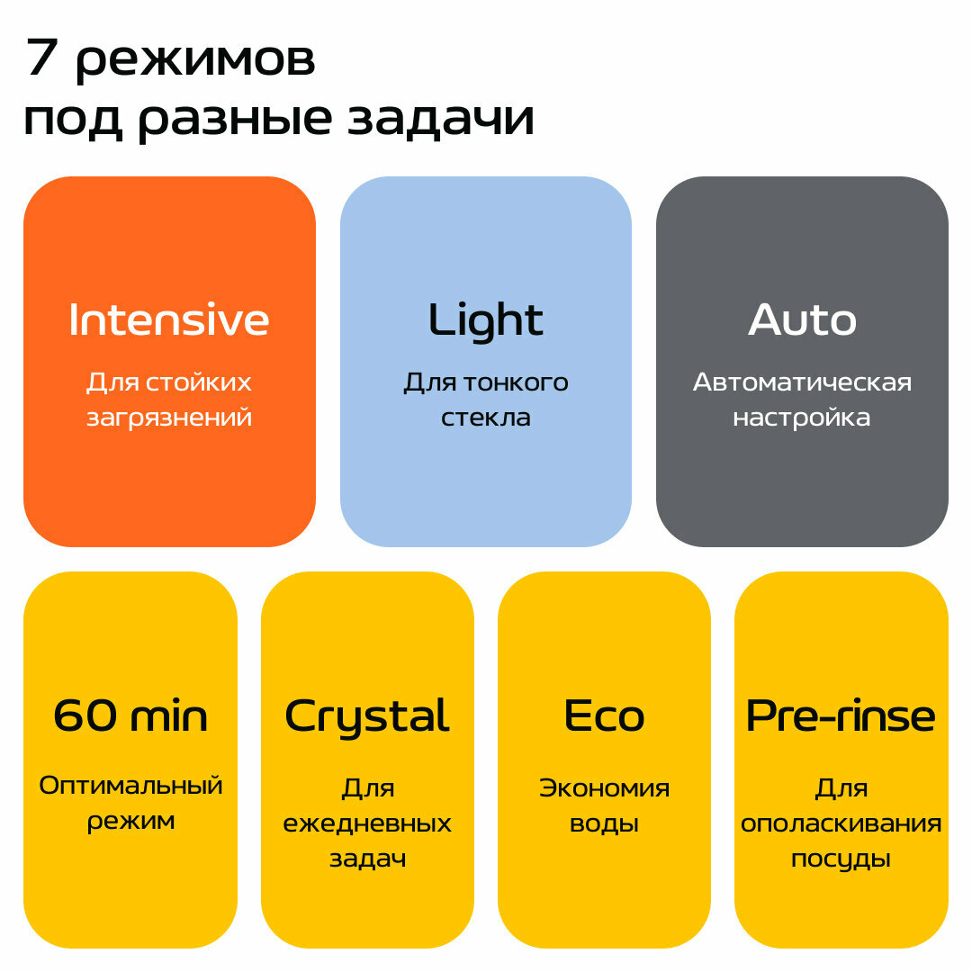 Годовое энергопотребление 237 кВт⋅ч (при 280 циклах стандартной мойки) - на 11% меньше аналогов в классе. Расход воды 9.5 л за цикл в режиме ECO: