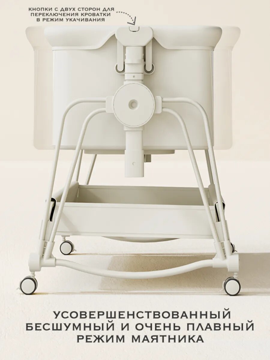 Маятниковый механизм поперечного качания обеспечивает плавное укачивание младенца одним движением руки. Система работает на подшипниках скольжения, которые производят менее 20 дБ шума - это соответствует уровню шепота. Режим фиксации маятника активируется специальным фиксатором при переводе ребенка на самостоятельный сон.