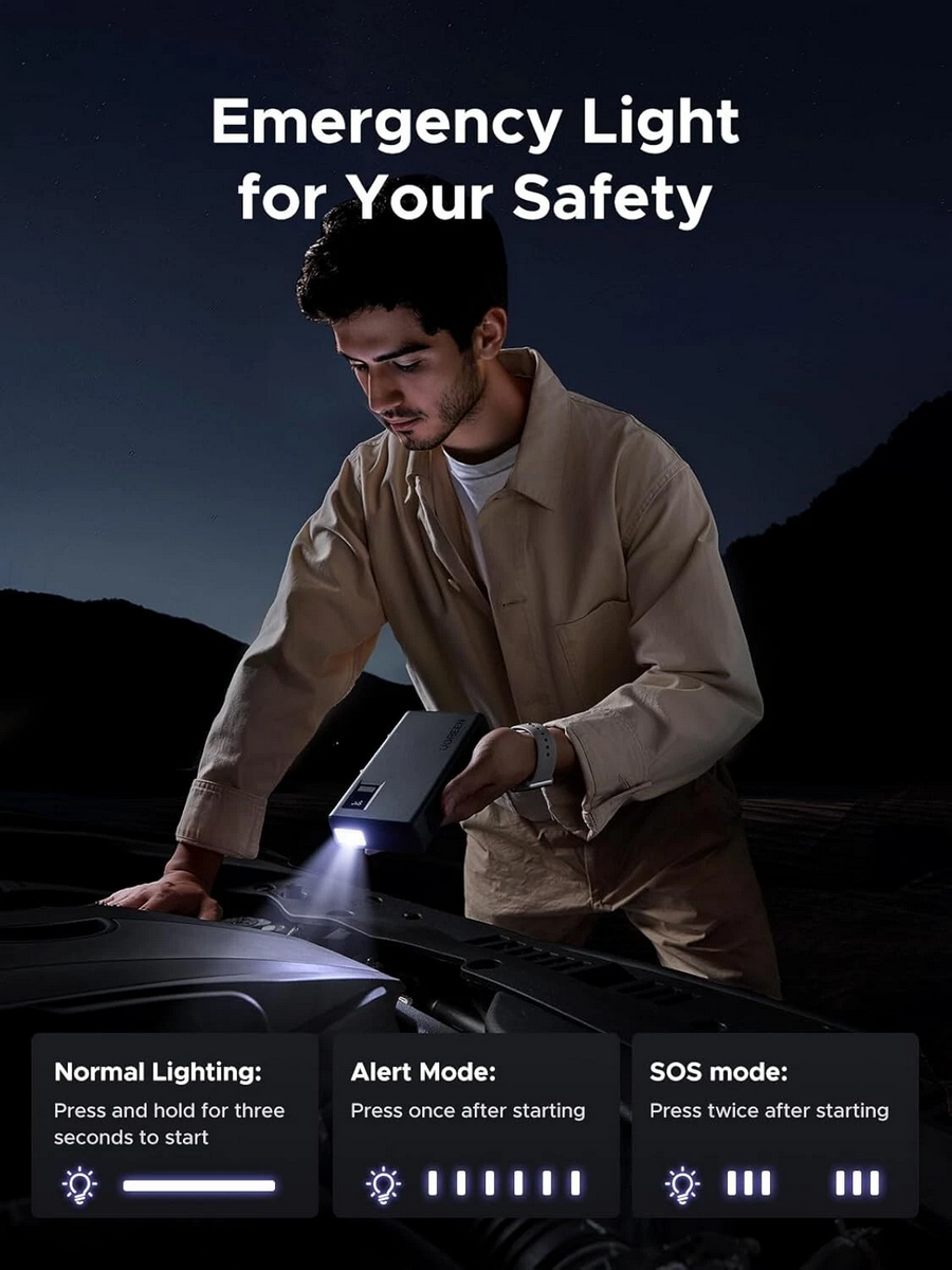 Пусковое устройство UGREEN ES702 решает главную проблему автомобилистов — запуск двигателя при полностью разряженном аккумуляторе. С пиковым током 1000 А и номинальным напряжением 12 В оно совместимо с бензиновыми двигателями до 7.0 л и дизельными до 5.5 л. Встроенная батарея 12000 мАч обеспечивает до 30 пусков на одном заряде по данным независимых тестов AutoBild.