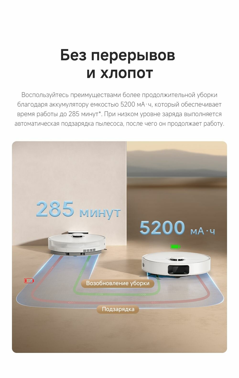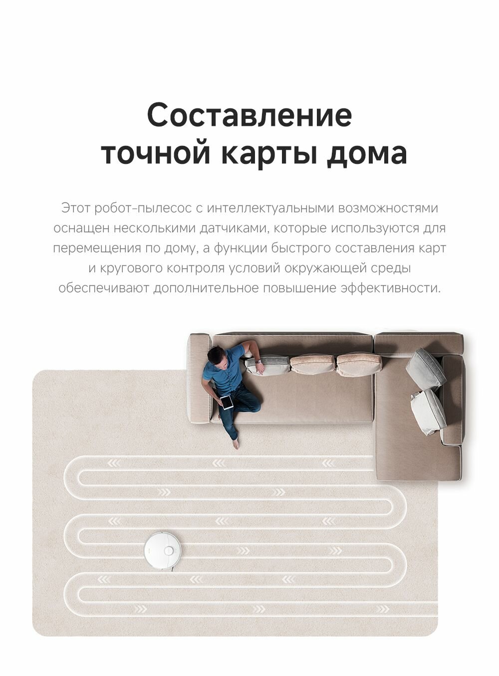 - Интеллектуальное картографирование через LiDAR и гироскоп строит схему помещения за 8 минут даже при слабой освещённости.