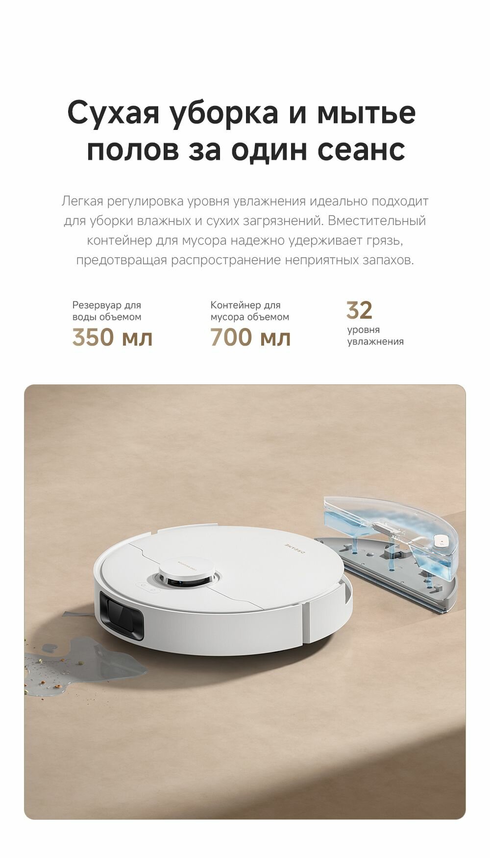 Dreame D20 White выполняет сверхзадачу: устраняет свежие пятна чая и разводы от мыльного раствора при влажной обработке, параллельно собирая крошки и шерсть животных сухим способом. Вам не придётся выбирать между двумя режимами — гибридный контейнер 0.57+0.27 л автоматически распределяет типы загрязнений. Решение особенно ценят родители и владельцы домашних питомцев.