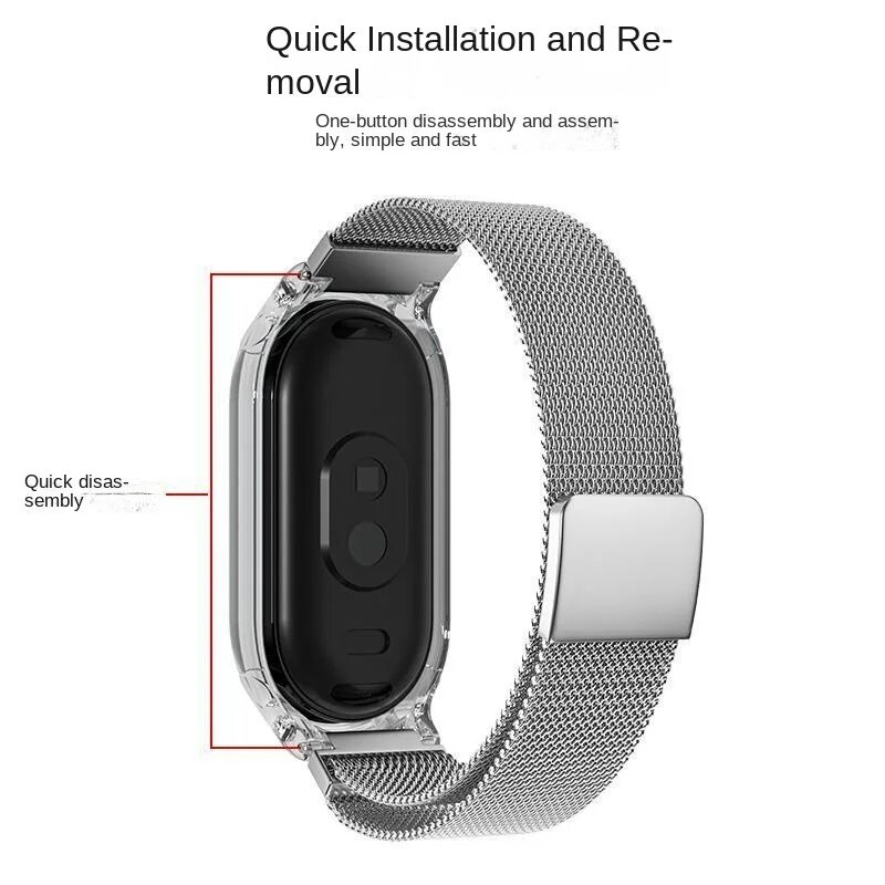 Ремешок специально разработан для беспроблемного монтажа на все поколения умных часов линейки Mi Band - от 3 до 8 модели, включая NFC-версии. Универсальная система крепления позволяет сменить штатный браслет Xiaomi за 10 секунд без инструментов. Для моделей 5-8 предусмотрена поддержка быстрого снятия - достаточно отщелкнуть фиксаторы по аналогии с оригинальными аксессуарами.