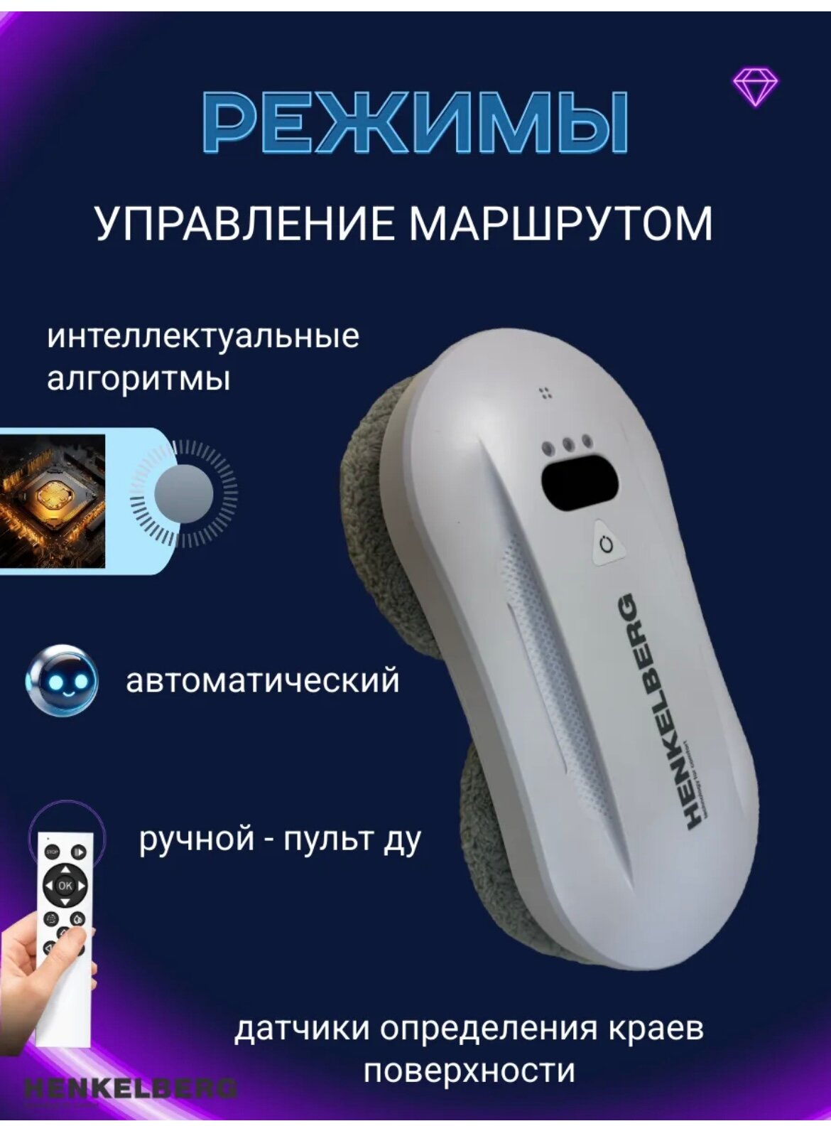 Страховочный шнур с карабином выдерживает нагрузку до 20 кг, предотвращая падение устройства с высоты. Для управления на расстоянии предусмотрен водонепроницаемый пульт ДУ с 15-метровым радиусом действия. При обнаружении препятствий или достижении края поверхности включается система автопроводки, которая: