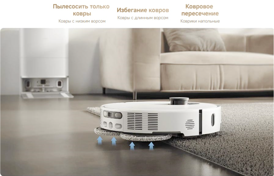 - Переключению скорости уборки при обнаружении ковров