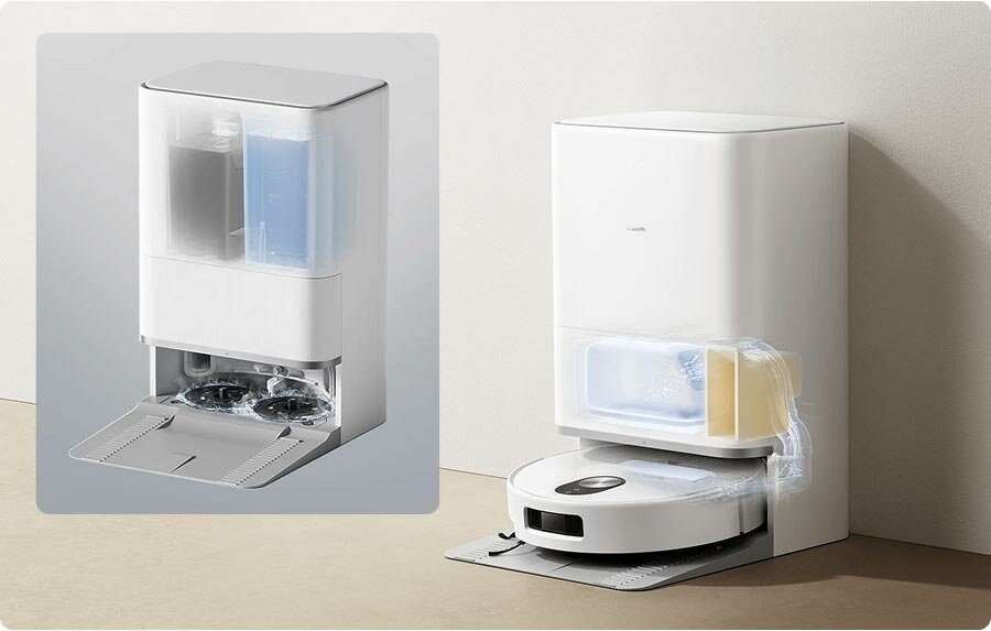 Комбинированный контейнер на 6.5 литров — ключевое отличие модели OV31GL от конкурентов. Вместительный отсек для мусора (2.5 л) дополнен 4-литровым резервуаром для воды с системой дозированного расхода. Это позволяет роботу: