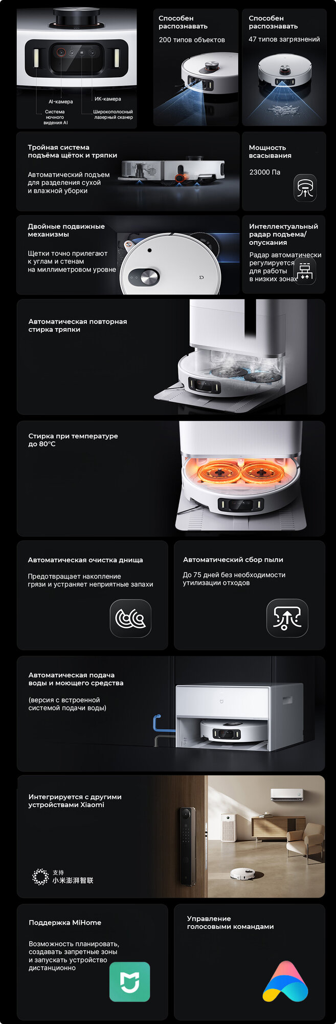 Мощность всасывания 23000 Па превращает Xiaomi Mijia 5 Pro в универсальный инструмент для разных типов покрытий. Аппарат удаляет: