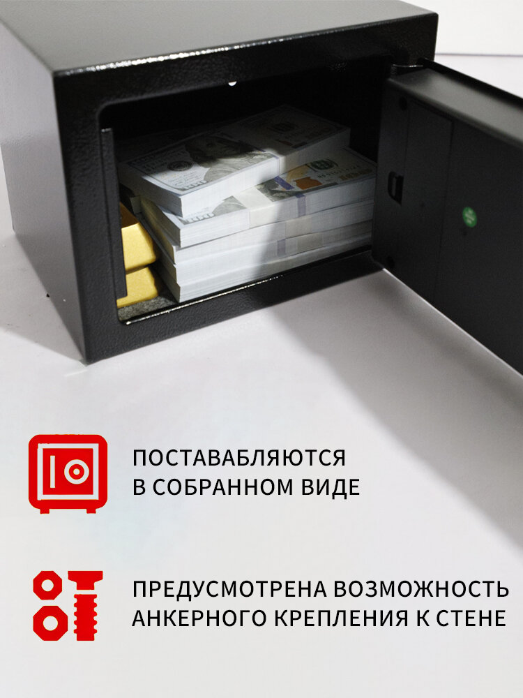 Габариты для установки: высота 34 см × ширина 40 см × глубина 26 см. Сейф поставляется с монтажным шаблоном, электродрелью и крепежными пластинами. Бесплатная доставка доступна при покупке от двух единиц или сумме заказа свыше 25 000 руб.