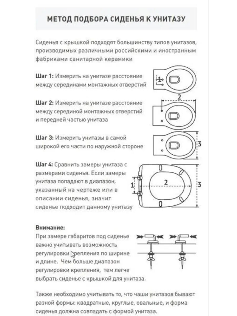- Совместимость: Овальные унитазы с межкрепёжным расстоянием 11-19 см
