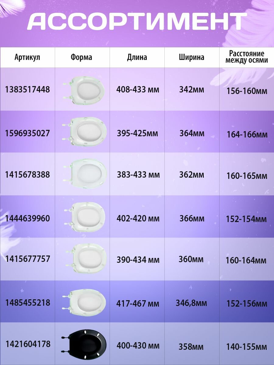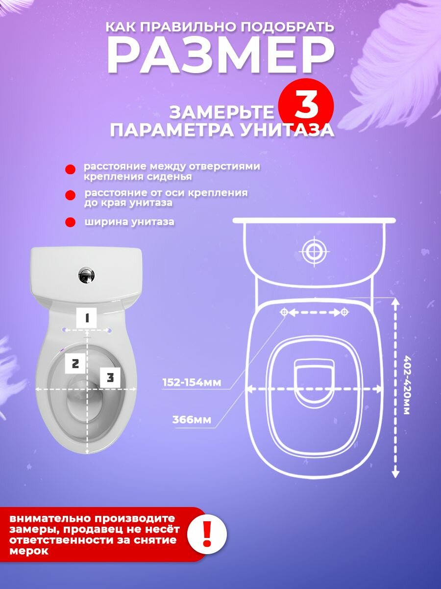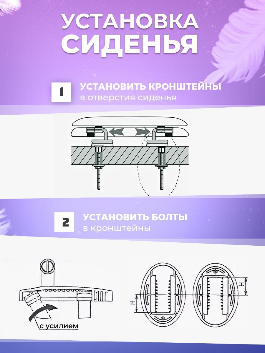 Овальная форма подходит для унитазов с длиной чаши 45-53 см. При нестандартных размерах рекомендуем использовать шаблон из комплекта для проверки совместимости.