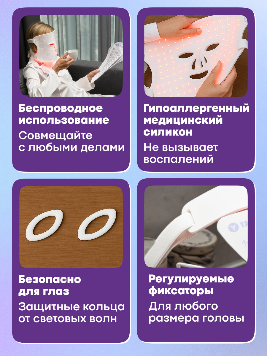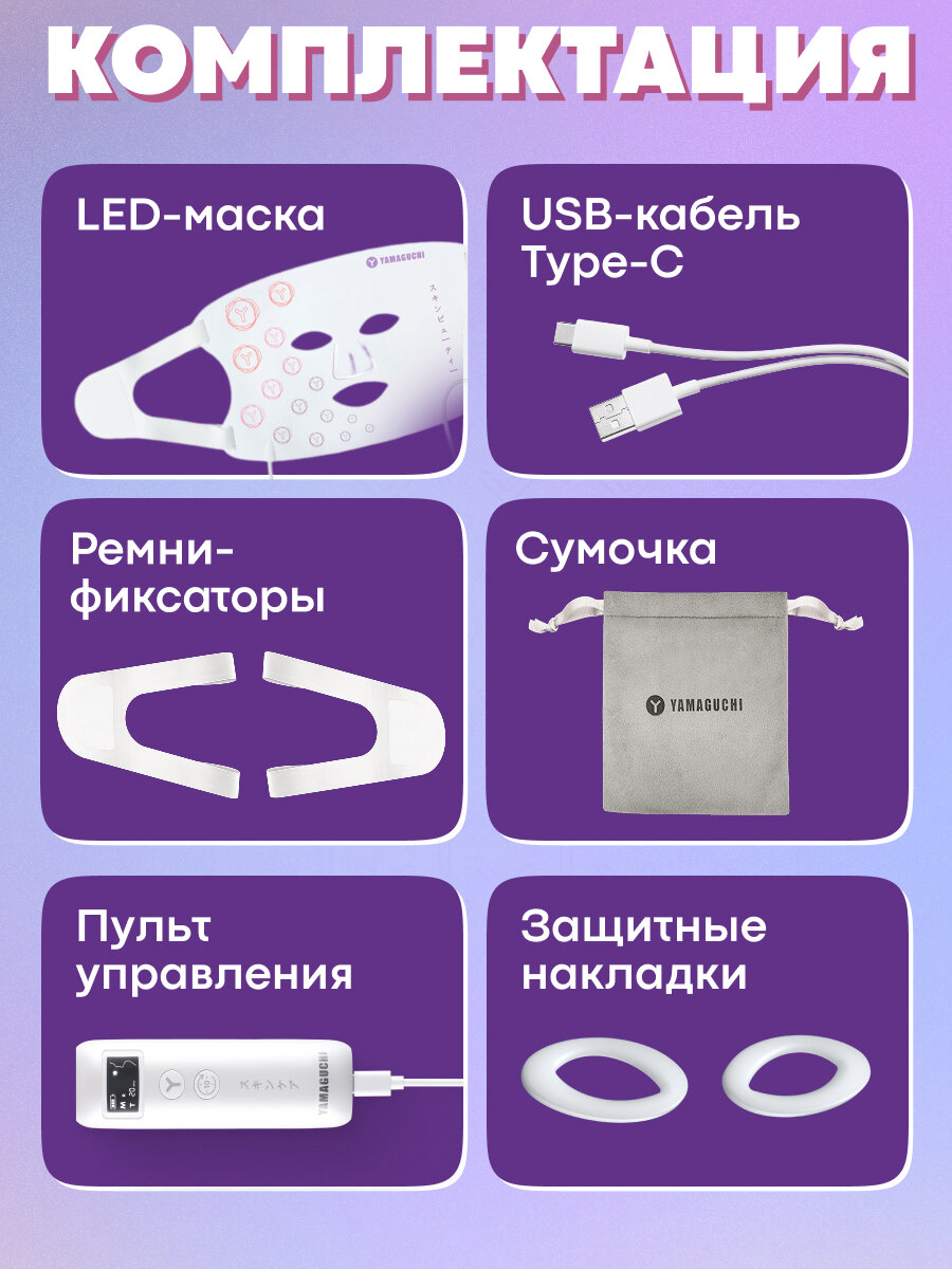 Светодиодная маска Yamaguchi LED Light Face Mask работает по принципу фотоомоложения с использованием трех спектров излучения: