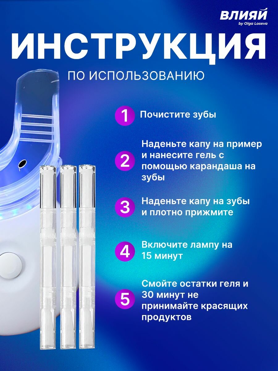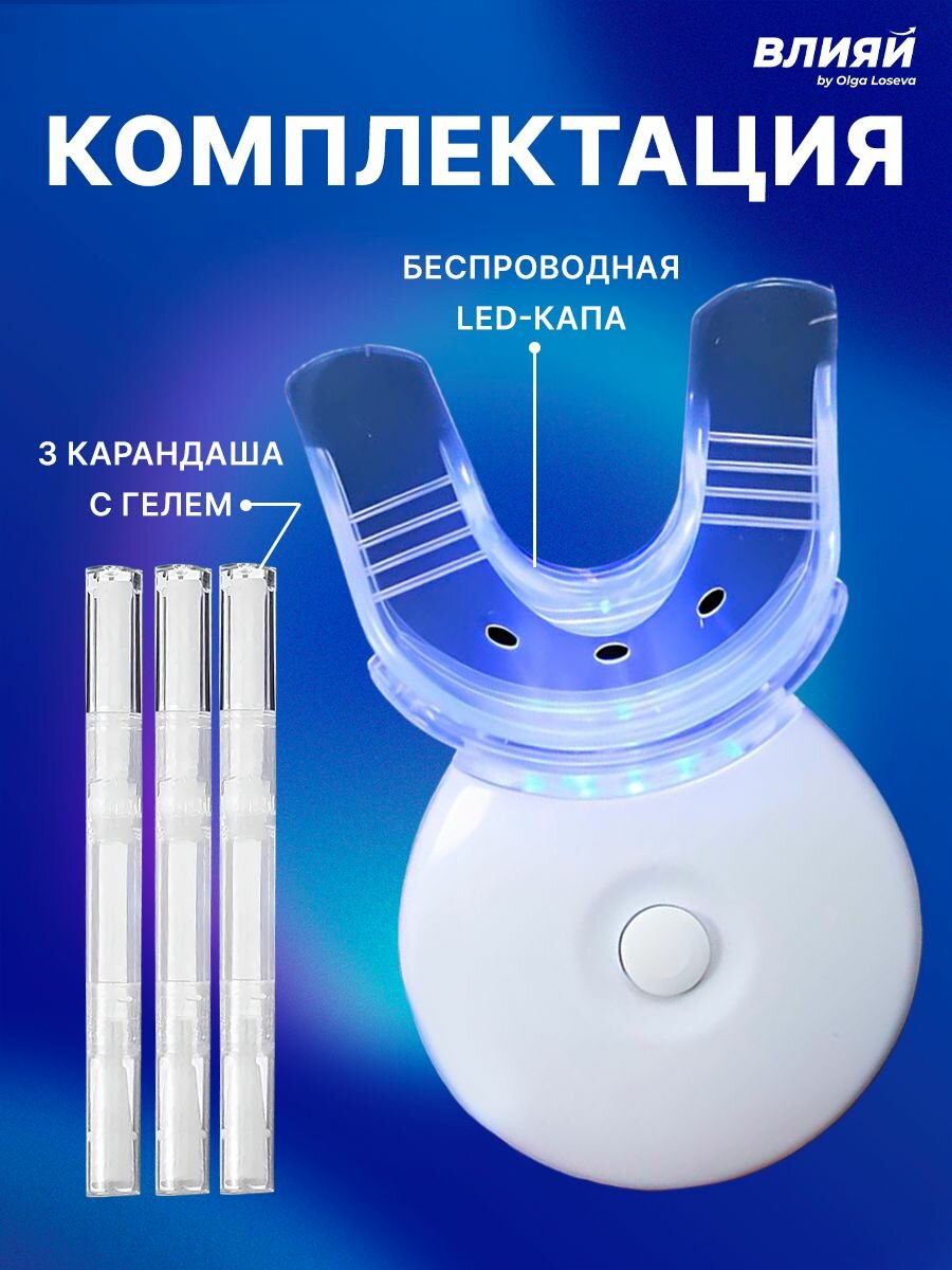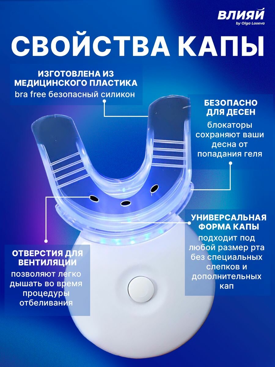 Набор для домашнего отбеливания зубов содержит гель с оптимальной концентрацией пероксида водорода (6%) и укрепляющие компоненты: