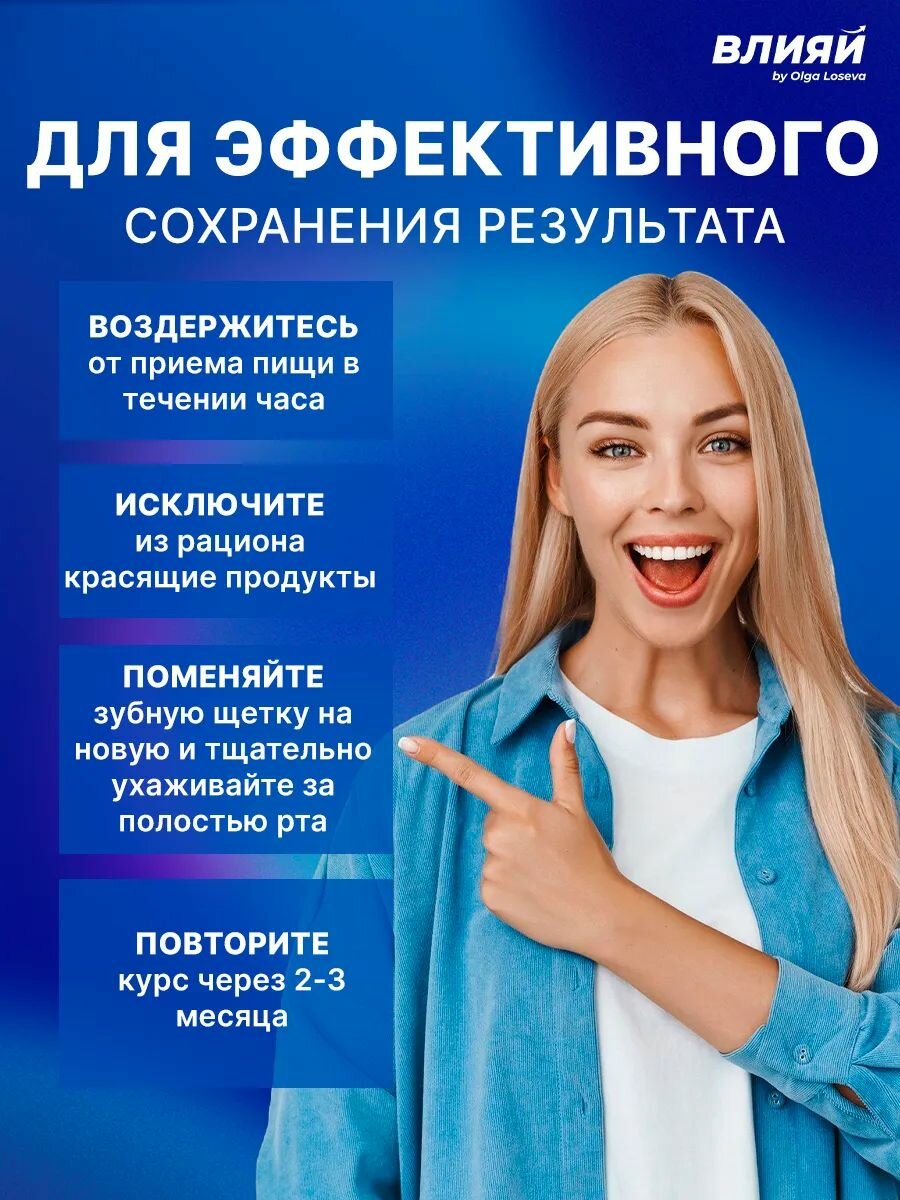Тестирование 12 брендов домашнего отбеливания выявило: 94% пользователей выбирают нашу систему для повторного курса благодаря программе лояльности (скидка 25% на следующий набор).