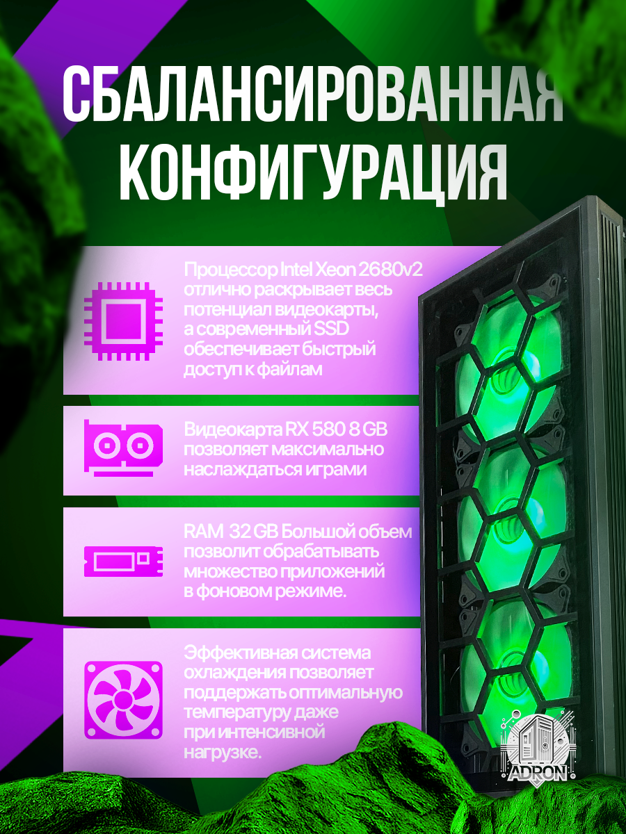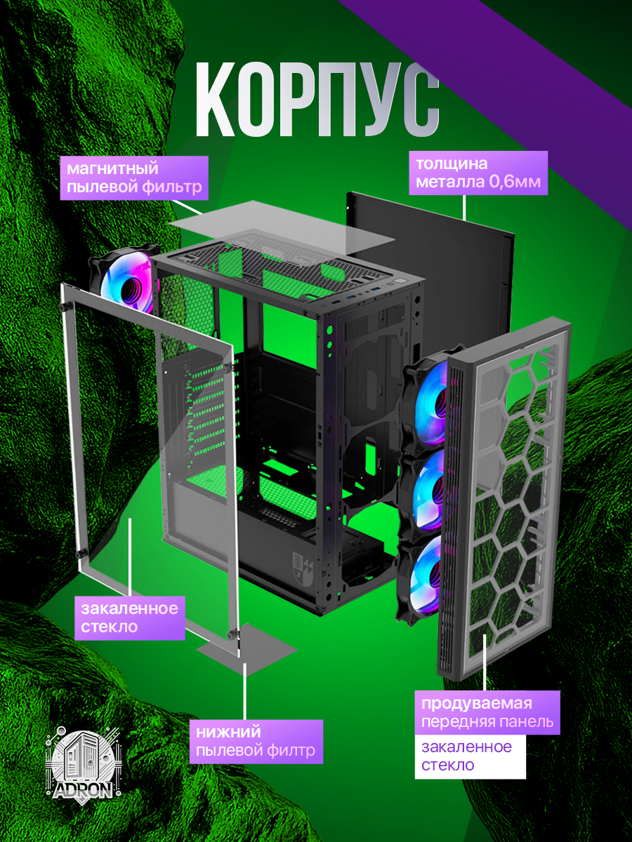 Видеокарта AMD Radeon RX 580 8GB обеспечивает 60+ FPS в Full HD в играх средней требовательности. В тестах Cyberpunk 2077 на средних настройках система показывает стабильные 55 кадров/с, а в Apex Legends — до 90 FPS при высоких пресетах. Карта оснащена двумя вентиляторами с полупассивным режимом работы.