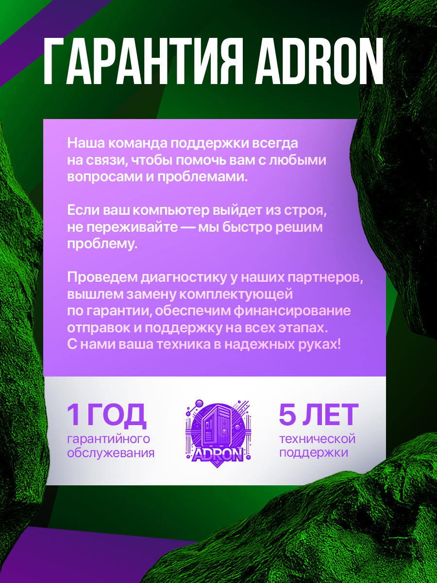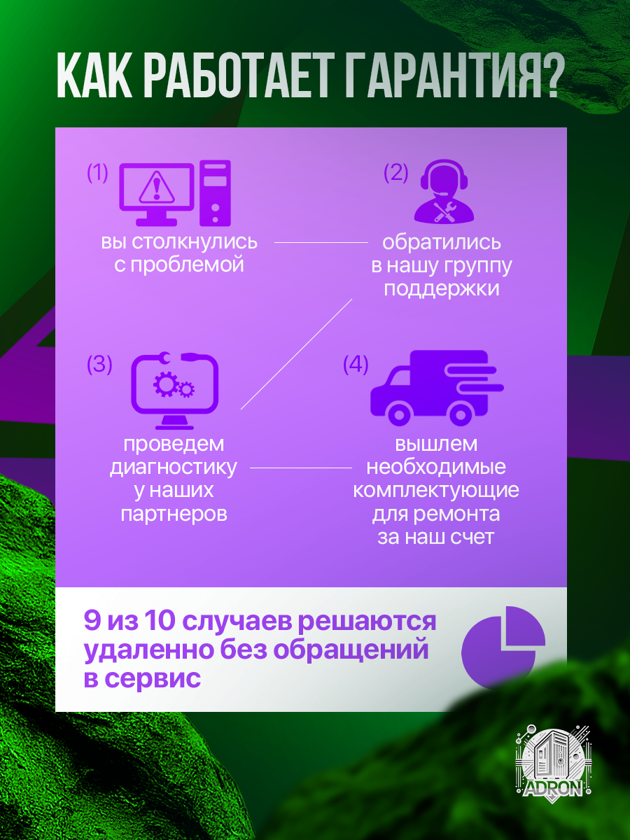 36 месяцев — базовый срок гарантии на системный блок. Сервисные центры в Москве (м. Киевская) и Санкт-Петербурге (м. Московская) выполняют: - Бесплатную диагностику в течение 3 дней - Чистку от пыли раз в 12 месяцев - Тестирование систем охлаждения