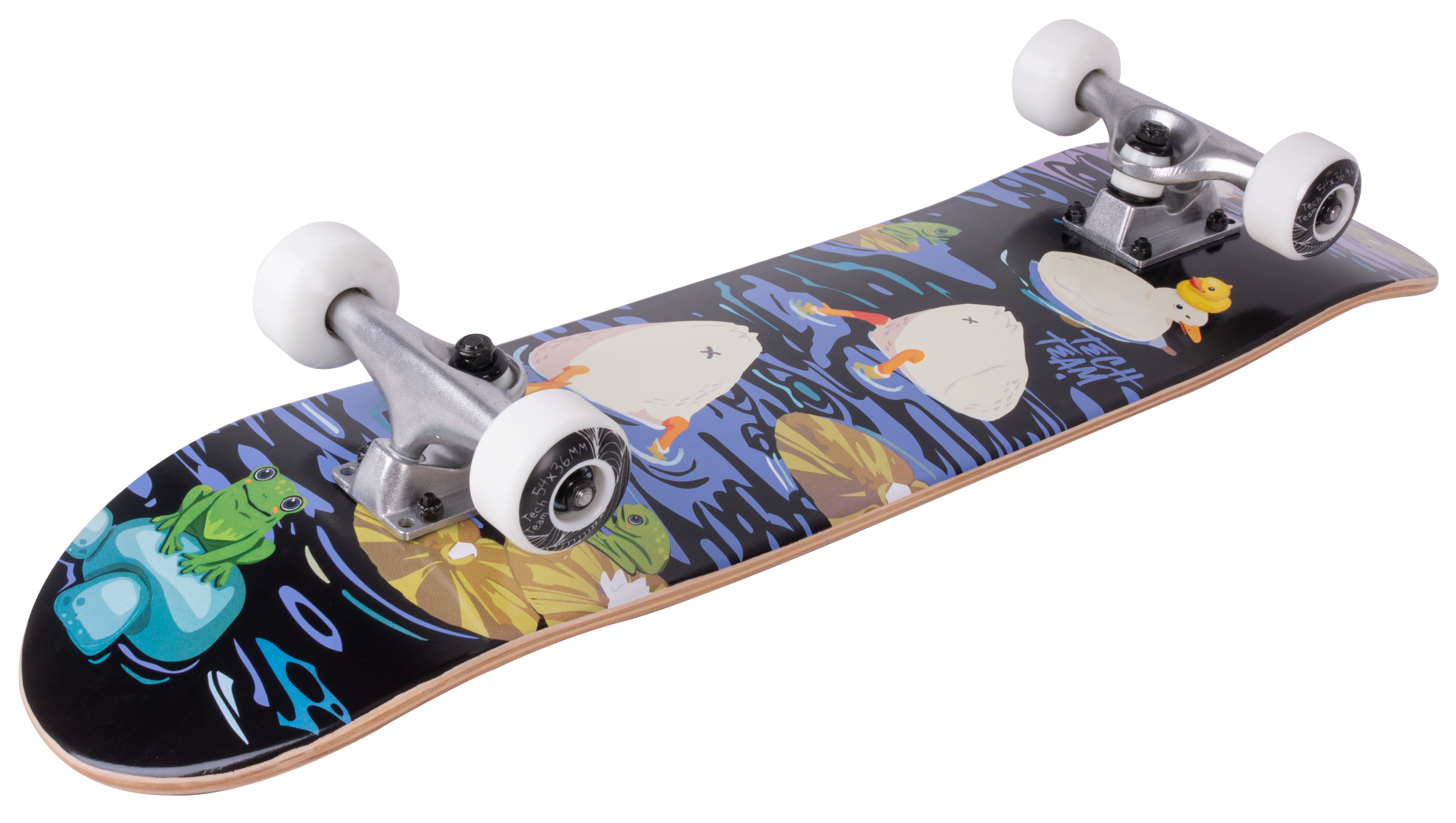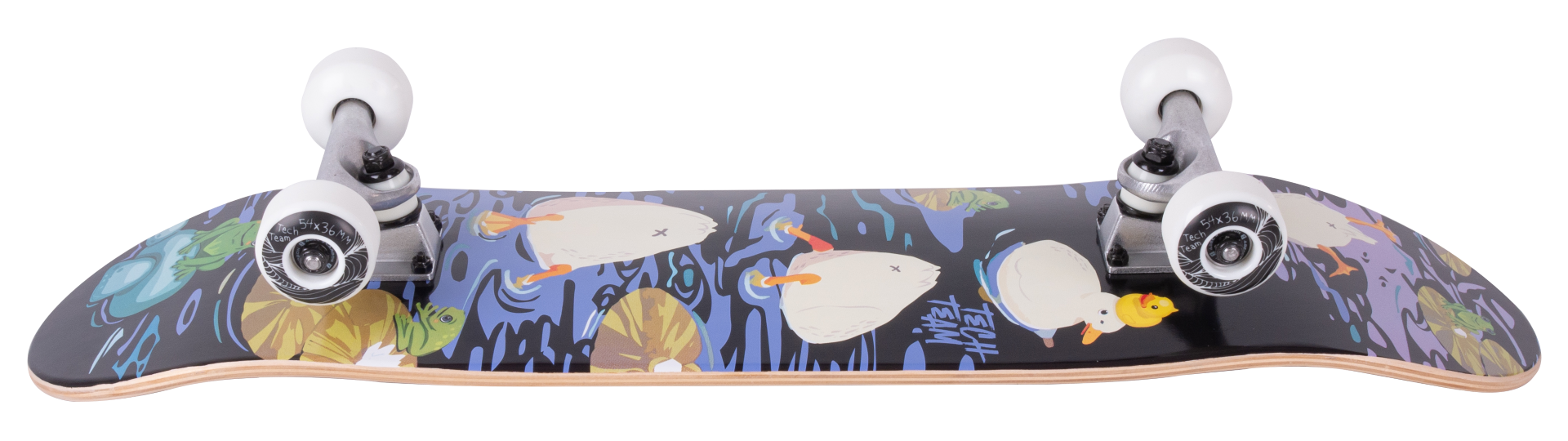 Двухкилограммовый скейтборд Tech Team Aliens 2024 с габаритами 29.5x7.25 дюймов разработан для трюкового катания. 7-слойный гибрид китайского и русского клёна (соотношение 5:2) проходит двойную прессовку — лабораторные испытания подтвердили устойчивость к нагрузкам до 110 кг при сохранении гибкости.
