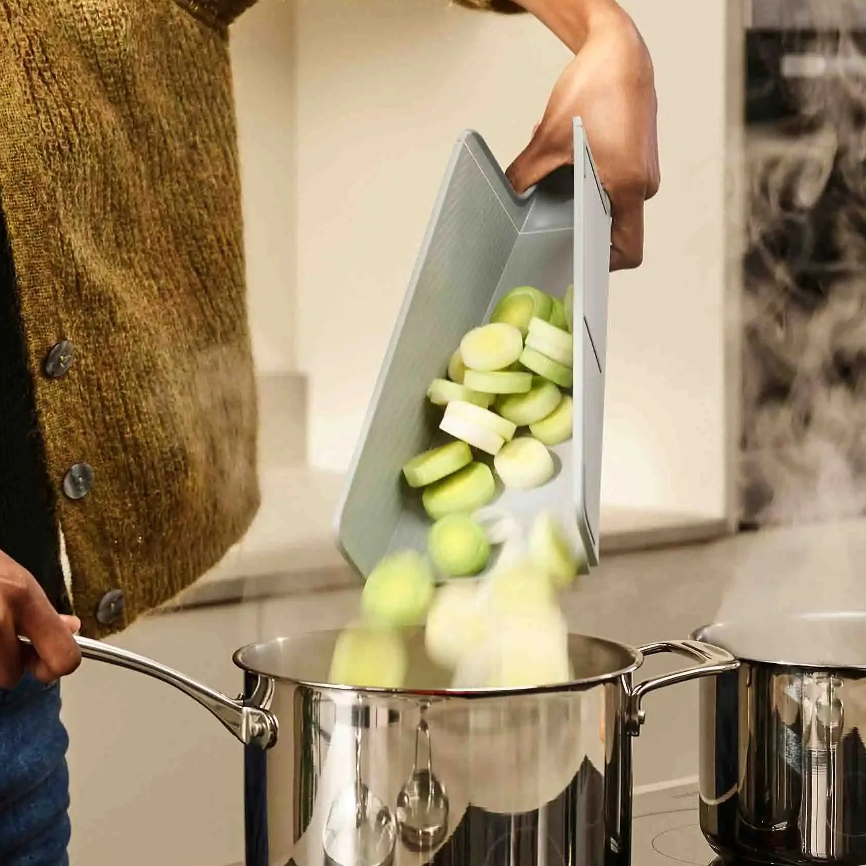 Joseph Joseph Chop2Pot Plus Regular – революционная складная разделочная доска с функцией переносного контейнера. Разработка английского бренда решает три ключевые проблемы: неустойчивость досок во время нарезки, нехватка места для хранения и трудности переноса нарезанных продуктов.